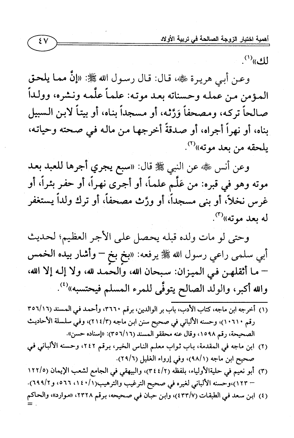 وعن أبي هريرة - رضي الله عنه -، قال: قال رسول الله - صلى الله عليه وسلم -: «إنَّ مما يلحق المؤمن من عمله وحسناته بعد موته: علماً علَّمه ونشره، وولداً صالحاً تركه، ومصحفاً وَرَّثه، أو مسجداً بناه، أو بيتاً لابن السبيل بناه، أو نهراً أجراه، أو صدقةً أخرجها من ماله في صحته وحياته، يلحقه من بعد موته» (¬2).