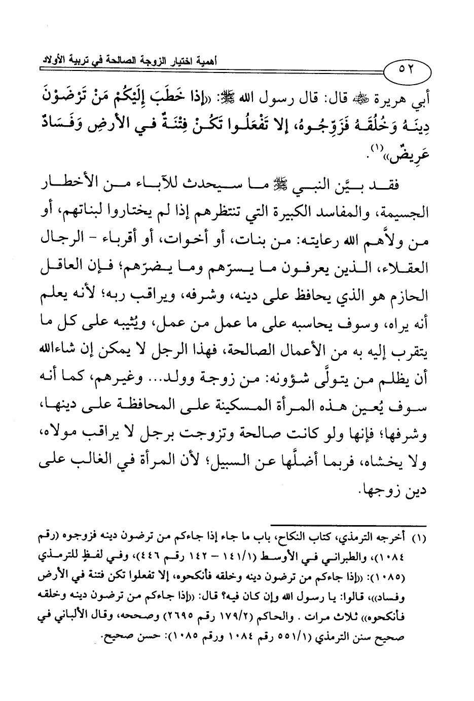 أبي هريرة - رضي الله عنه - قال: قال رسول الله - صلى الله عليه وسلم -: ((إذا خَطَبَ إِلَيْكُمْ مَنْ تَرْضَوْنَ دِينَهُ وَخُلُقَهُ فَزَوِّجُوهُ، إلا تَفْعَلُوا تَكُنْ فِتْنَةٌ في الأرضِ وَفَسَادٌ عَرِيضٌ)) (¬1).