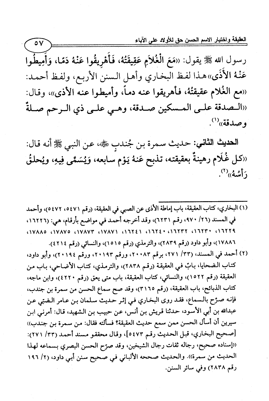 (¬1) البخاري، كتاب العقيقة، باب إماطة الأذى عن الصبي في العقيقة، (رقم 5471، 5472)، وأحمد في المسند (26/ 970، رقم 6231)، وقد أخرجه أحمد في مواضع بأرقام، هي: (16226، 16229، 16230، 16232، 16240، 16241، 17871، 17873، 17875، 17885، 17886)، وأبو داود (رقم 2839)، والترمذي (رقم 1515)، والنسائي (رقم 4214).