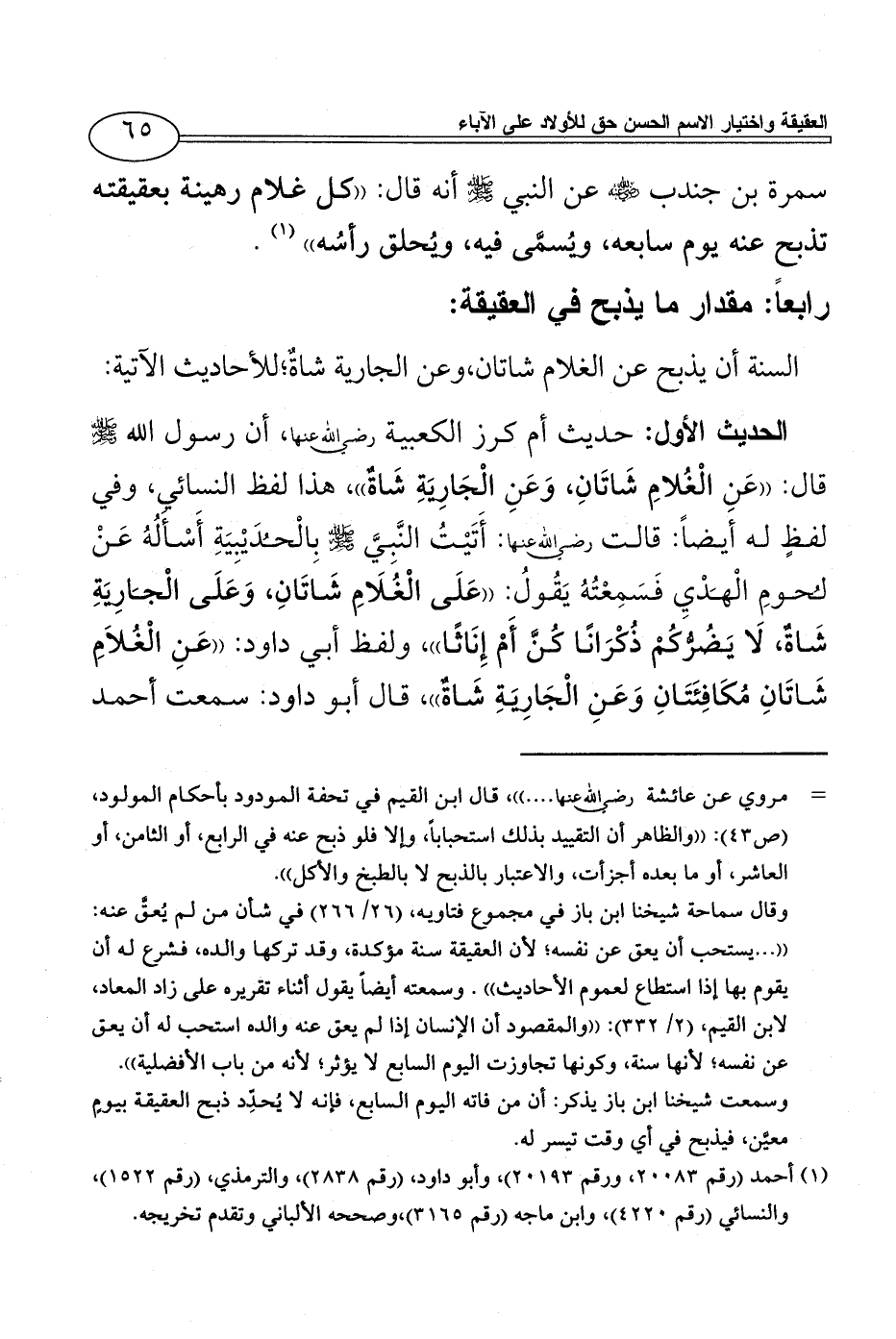 الحديث الأول: حديث أم كرز الكعبية رضي الله عنها، أن رسول الله - صلى الله عليه وسلم - قال: ((عَنِ الْغُلامِ شَاتَانِ، وَعَنِ الْجَارِيَةِ شَاةٌ))، هذا لفظ النسائي، وفي لفظٍ له أيضاً: قالت رضي الله عنها: أَتَيْتُ النَّبِيَّ - صلى الله عليه وسلم - بِالْحُدَيْبِيَةِ أَسْأَلُهُ عَنْ لُحومِ الْهَدْيِ فَسَمِعْتُهُ يَقُولُ: ((عَلَى الْغُلَامِ شَاتَانِ، وَعَلَى الْجَارِيَةِ شَاةٌ، لَا يَضُرُّكُمْ ذُكْرَانًا كُنَّ أَمْ إِنَاثًا))، ولفظ أبي داود: ((عَنِ الْغُلاَمِ شَاتَانِ مُكَافِئَتَانِ وَعَنِ الْجَارِيَةِ شَاةٌ))، قال أبو داود: سمعت أحمد