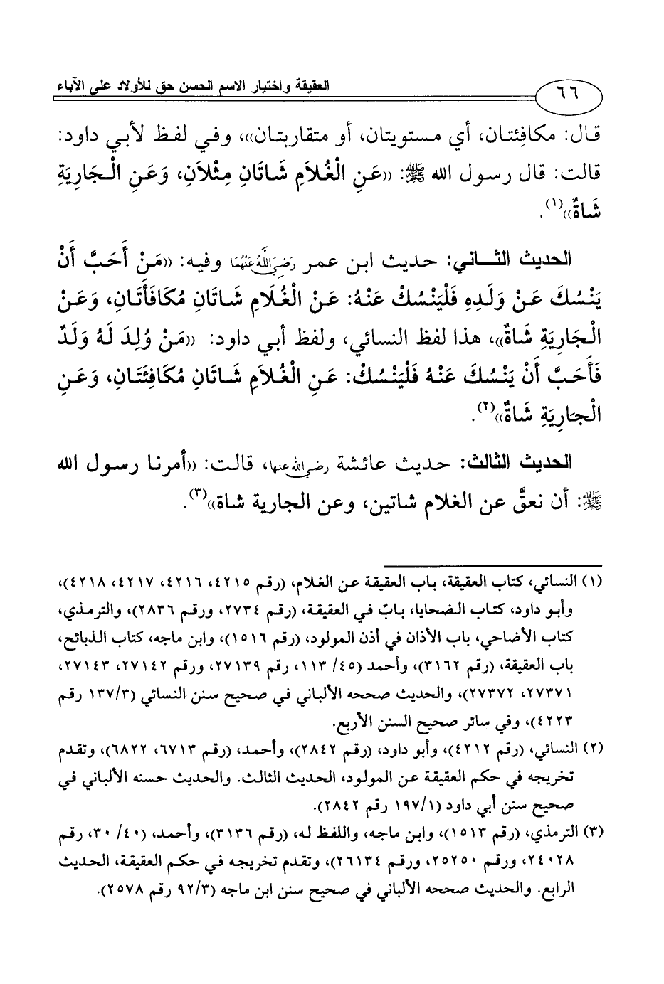 الحديث الثاني: حديث ابن عمر رَضِيَ اللَّهُ عَنْهُمَا وفيه: ((مَنْ أَحَبَّ أَنْ يَنْسُكَ عَنْ وَلَدِهِ فَلْيَنْسُكْ عَنْهُ: عَنْ الْغُلَامِ شَاتَانِ مُكَافَأَتَانِ، وَعَنْ الْجَارِيَةِ شَاةٌ))، هذا لفظ النسائي، ولفظ أبي داود: ((مَنْ وُلِدَ لَهُ وَلَدٌ فَأَحَبَّ أَنْ يَنْسُكَ عَنْهُ فَلْيَنْسُكْ: عَنِ الْغُلاَمِ شَاتَانِ مُكَافِئَتَانِ، وَعَنِ الْجَارِيَةِ شَاةٌ)) (¬2).