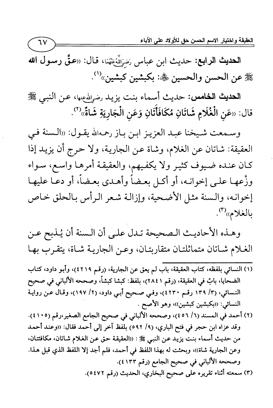 الحديث الخامس: حديث أسماء بنت يزيد رضي الله عنها، عن النبي - صلى الله عليه وسلم - قال: ((عَنِ الْغُلَامِ شَاتَانِ مُكَافَأَتَانِ وَعَنِ الْجَارِيَةِ شَاةٌ)) (¬2).