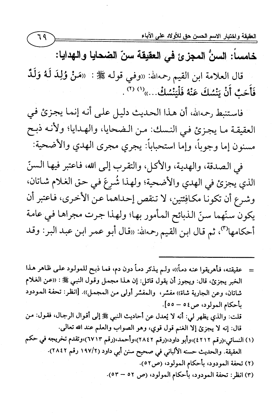 في الصدقة، والهدية، والأكل، والتقرب إلى الله، فاعتبر فيها السنّ الذي يجزئ في الهدي والأضحية؛ ولهذا شُرِعَ في حق الغلام شاتان، وشرع أن تكونا مكافِئتين، لا تنقص إحداهما عن الأخرى، فاعتبر أن يكون سنّهما سنّ الذبائح المأمور بها؛ ولهذا جرت مجراها في عامة أحكامها (¬3)، ثم قال ابن القيم رحمه الله: ((قال أبو عمر ابن عبد البر: وقد
