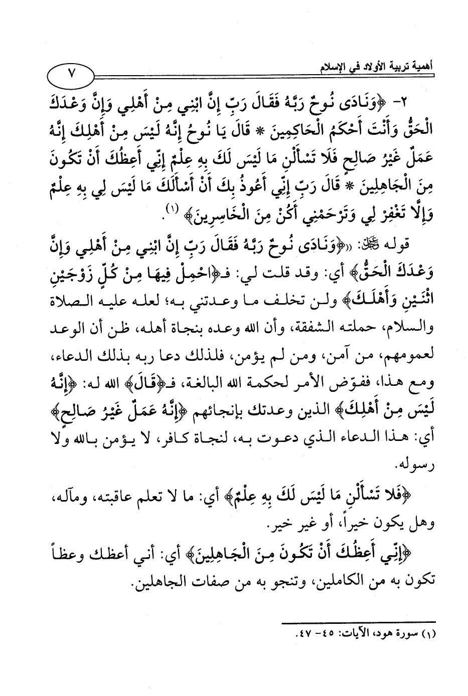 2 - (وَنَادَى نُوحٌ رَبَّهُ فَقَالَ رَبِّ إِنَّ ابْنِي مِنْ أَهْلِي وَإِنَّ وَعْدَكَ الْحَقُّ وَأَنْتَ أَحْكَمُ الْحَاكِمِينَ * قَالَ يَا نُوحُ إِنَّهُ لَيْسَ مِنْ أَهْلِكَ إِنَّهُ عَمَلٌ غَيْرُ صَالِحٍ فَلَا تَسْأَلْنِ مَا لَيْسَ لَكَ بِهِ عِلْمٌ إِنِّي أَعِظُكَ أَنْ تَكُونَ مِنَ الْجَاهِلِينَ * قَالَ رَبِّ إِنِّي أَعُوذُ بِكَ أَنْ أَسْأَلَكَ مَا لَيْسَ لِي بِهِ عِلْمٌ وَإِلَّا تَغْفِرْ لِي وَتَرْحَمْنِي أَكُنْ مِنَ الْخَاسِرِينَ) (¬1).