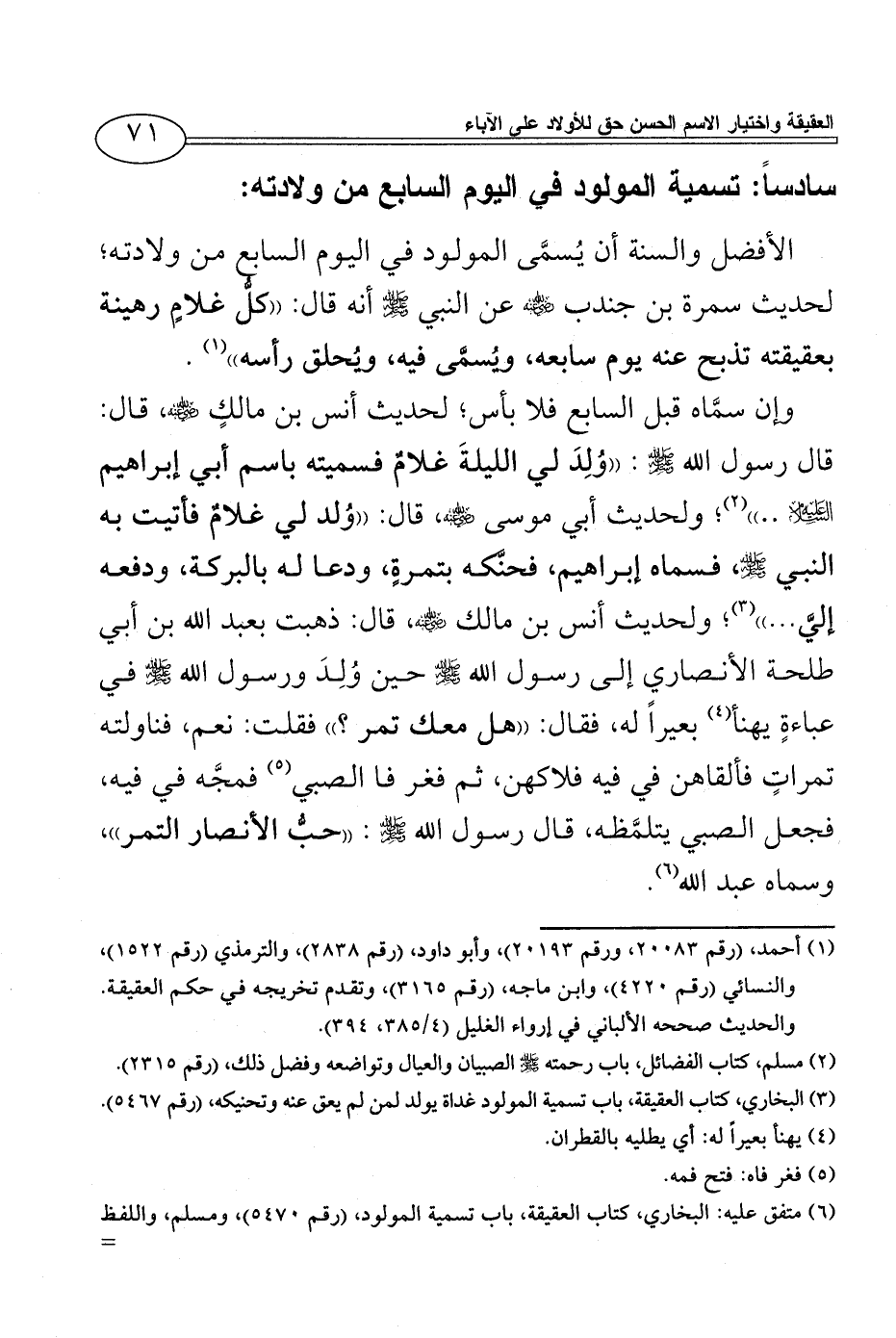 (¬3) البخاري، كتاب العقيقة، باب تسمية المولود غداة يولد لمن لم يعق عنه وتحنيكه، (رقم 5467).