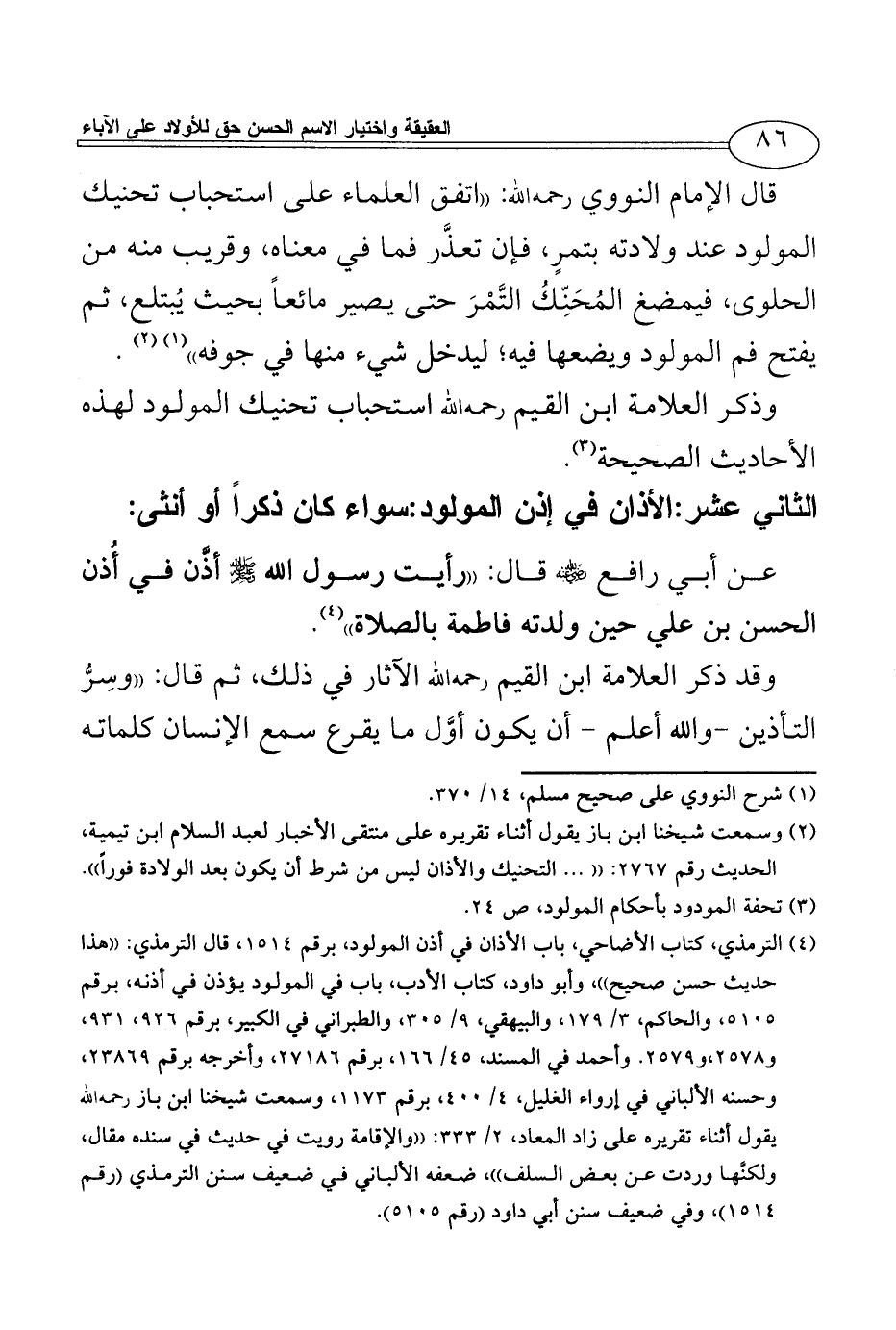 (¬2) وسمعت شيخنا ابن باز يقول أثناء تقريره على منتقى الأخبار لعبد السلام ابن تيمية، الحديث رقم 2767: (( ... التحنيك والأذان ليس من شرط أن يكون بعد الولادة فوراً)).