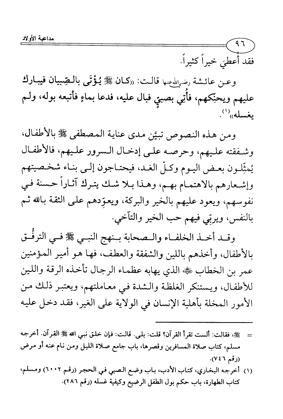 (¬1) أخرجه البخاري، كتاب الأدب، باب وضع الصبي في الحجر (رقم 6002) ومسلم، كتاب الطهارة، باب حكم بول الطفل الرضيع وكيفية غسله (رقم 286).