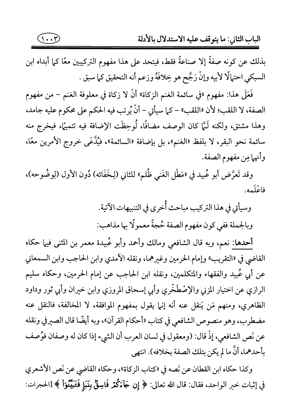 فَعَلَى هذا: مفهوم"في سائمة الغنم الزكاة" أنْ لا زكاة في معلوفة الغنم - من مفهوم الصفة، لا اللقب؛ لأن "اللقب" - كما سيأتي - أنْ يُرتب فيه الحكم على محكوم عليه جامد، وهذا مشتق، ولكنه لَمَّا كان الوصف مضافًا، لُوحِظَت الإضافة فيه تتميمًا، فيخرج منه سائمة نحو البقر، لا بلفظ "الغنم"، بل بإضافة "السائمة"، فيُدَّعَى خروج الأمرين معشًا، وأنهما مِن مفهوم الصفة.