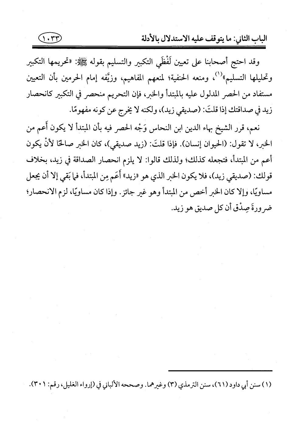 وقد احتج أصحابنا على تعيين لَفْظَي التكبير والتسليم بقوله - صلى الله عليه وسلم -: "تحريمها التكبير وتحليلها التسليم" (¬١)، ومنعه الحنفية؛ لمنعهم المفاهيم، وزيَّفه إمام الحرمين بأن التعيين مستفاد من الحصر المدلول عليه بالمبتدأ والخبر، فإن التحريم منحصر في التكبير كانحصار زيد في صداقتك إذا قلتَ: (صديقي زيد)، ولكنه لا يخرج عن كونه مفهومًا.