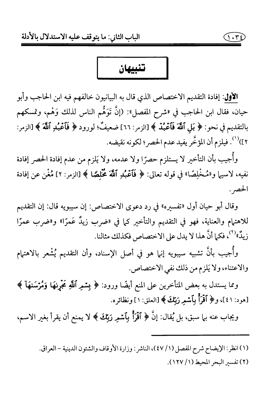 الأول: إفادة التقديم الاختصاص الذي قال به البيانيون خالفهم فيه ابن الحاجب وأبو حيان، فقال ابن الحاجب في "شرح المفصل": (إنَّ تَوَهُّم الناس لذلك وَهْم، وتمسكهم بالتقديم في نحو: {بَلِ اللَّهَ فَاعْبُدْ} [الزمر: ٦٦] ضعيفٌ؛ لورود {فَاعْبُدِ اللَّهَ} [الزمر: ٢]) (¬١). فيلزم أن المؤخَّر يفيد عدم الحصر، لكونه نقيضه.