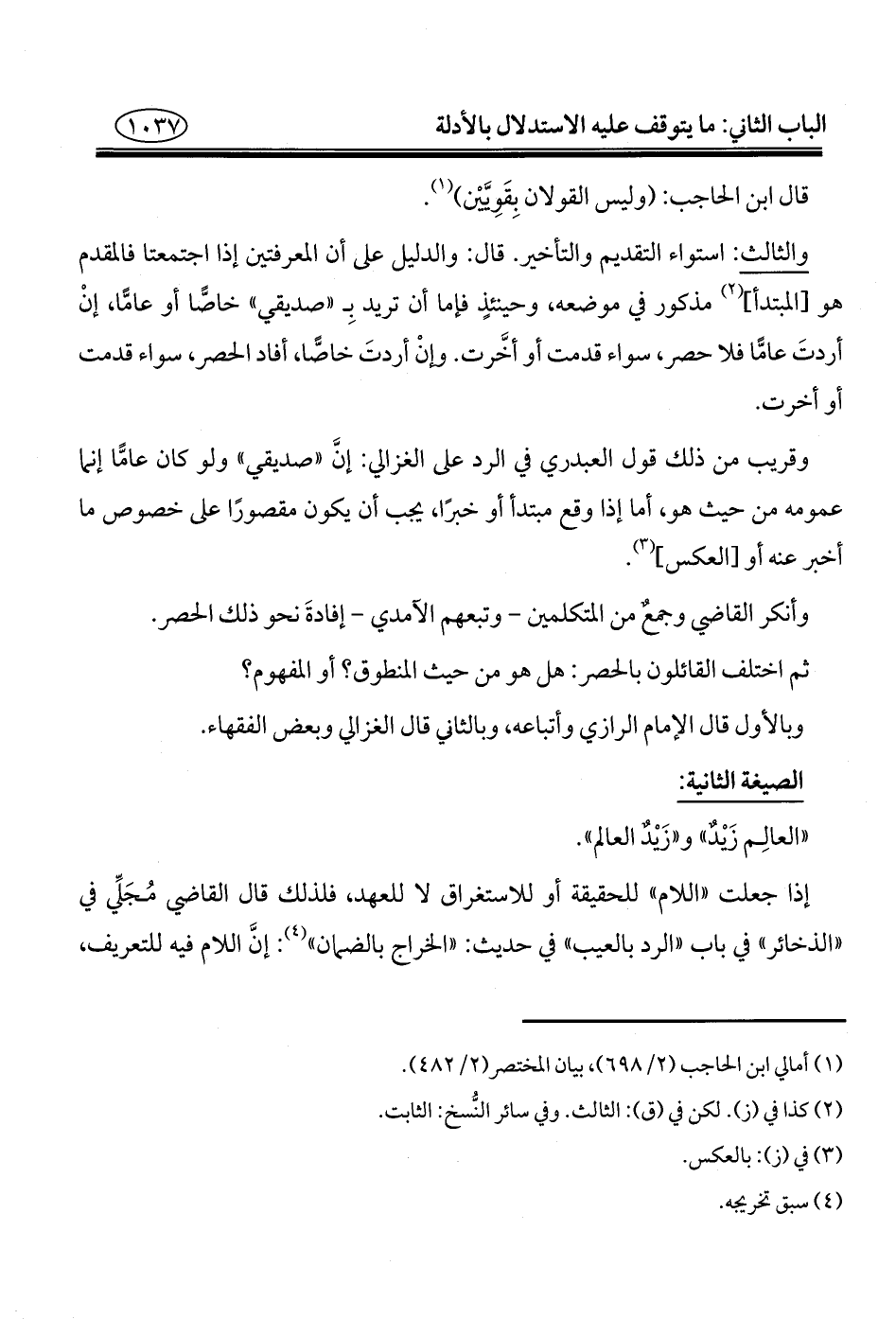 وأنكر القاضي وجمعٌ من المتكلمين -وتبعهم الآمدي- إفادةَ نحو ذلك الحصر.
