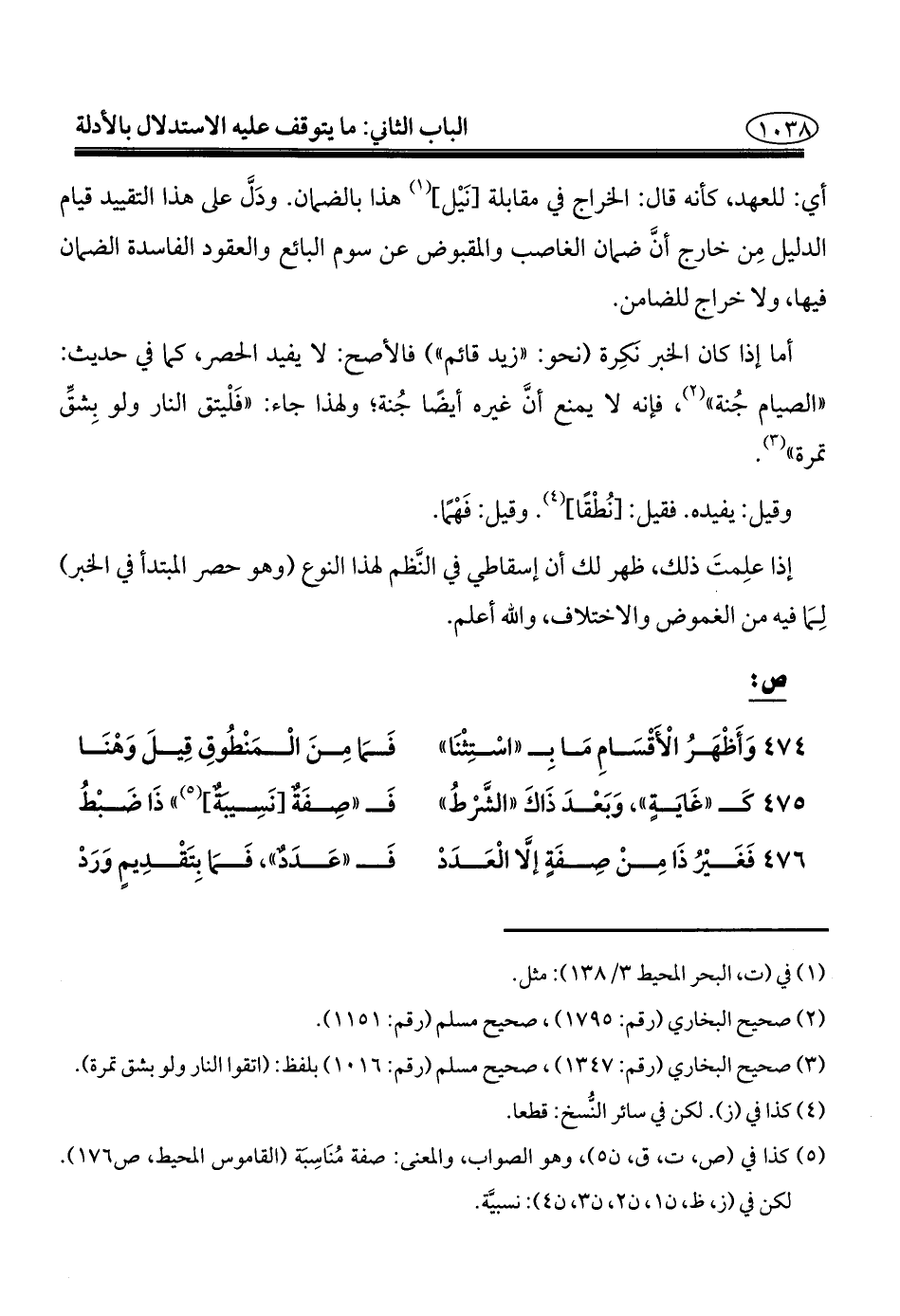أما إذا كان الخبر بمِرة (نحو: "زيد قائم") فالأصح: لا يفيد الحصر، كما في حديث: "الصيام جُنة" (¬٢)، فإنه لا يمنع أنَّ غيره أيضًا جُنة؛ ولهذا جاء: "فَلْيتق النار ولو بِشقِّ تمرة" (¬٣).