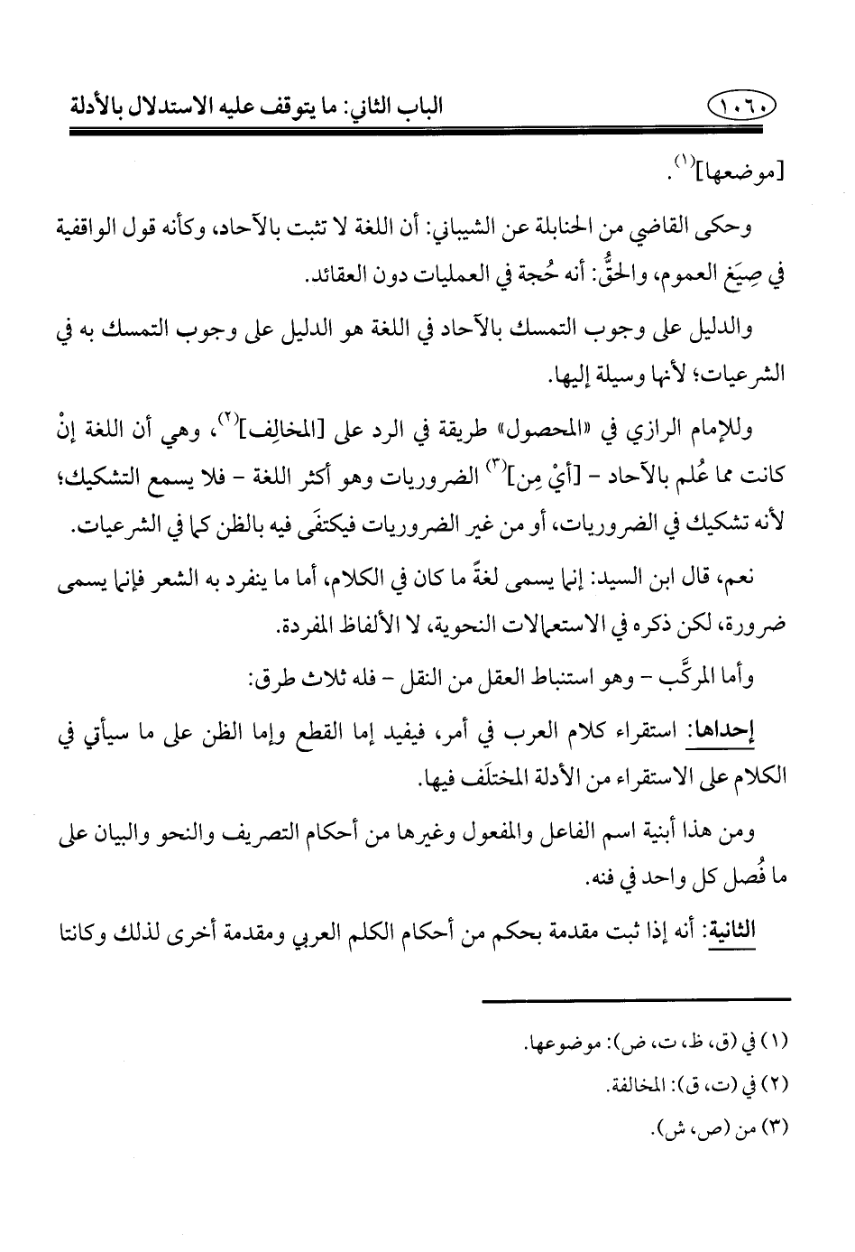 وللإمام الرازي في "المحصول" طريقة في الرد على [المخالِف] (¬٢)، وهي أن اللغة إنْ كانت مما عُلم بالاحاد -[أيْ مِن] (¬٣) الضروريات وهو أكثر اللغة- فلا يسمع التشكيك؛ لأنه تشكيك في الضروريات، أو من غير الضروريات فيكتفَى فيه بالظن كما في الشرعيات.