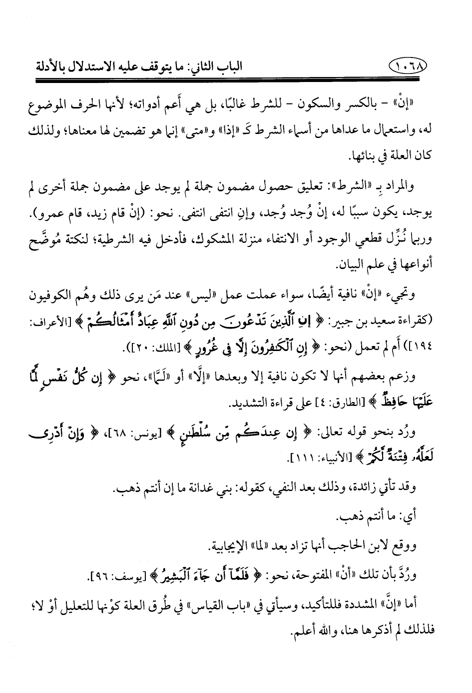 وزعم بعضهم أنها لا تكون نافية إلا وبعدها "إلَّا" أو "لَما"، نحو {إِنْ كُلُّ نَفْسٍ لَمَّا عَلَيْهَا حَافِظٌ} [الطارق: ٤] على قراءة التشديد.