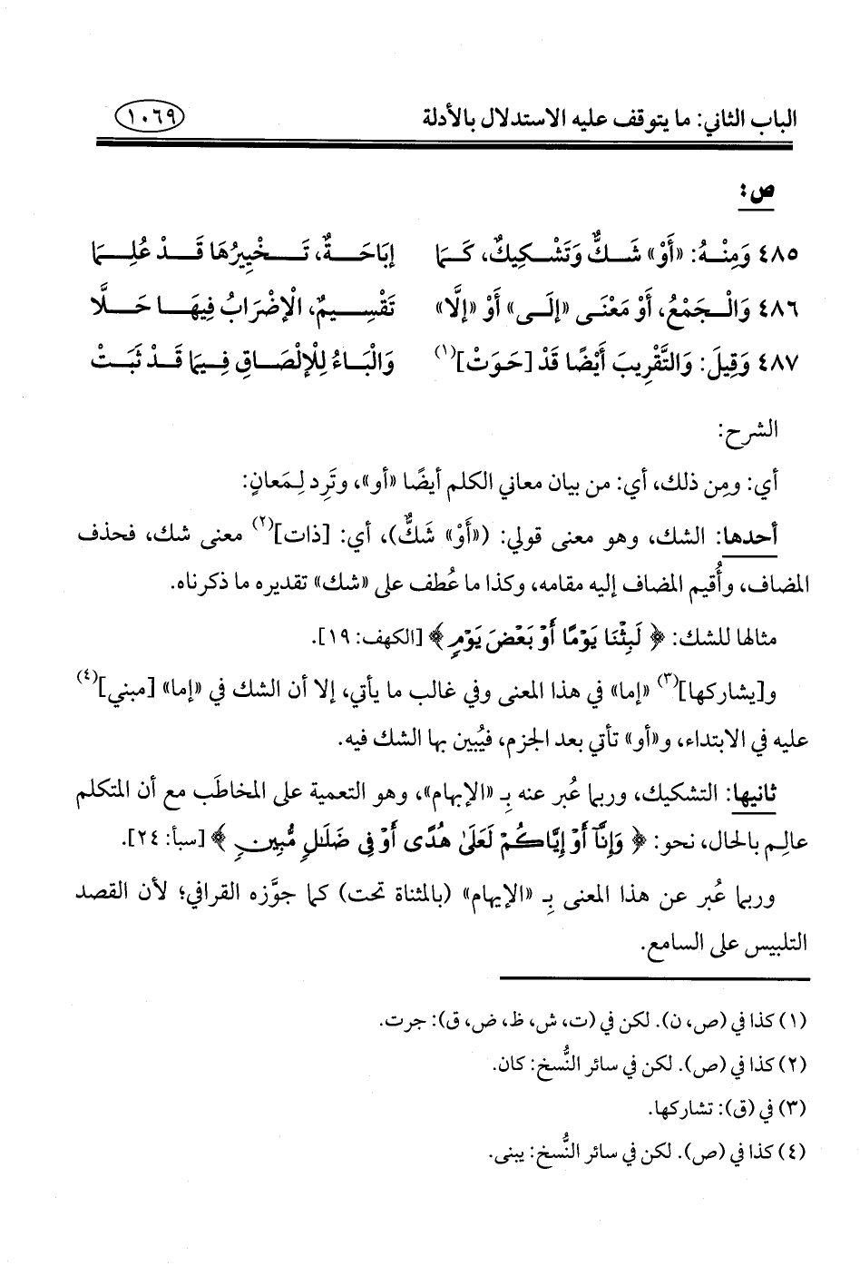 ٤٨٥ - وَمنْهُ: "أَوْ" شَكٌّ وَتَشْكِيكٌ، كَمَا ... إبَاحَةٌ، تَخْيِيرُهَا قَدْ عُلِمَا