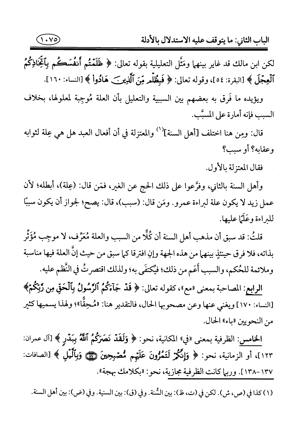 لكن ابن مالك قد غاير بينهما ومَثَّل التعليلية بقوله تعالى: {ظَلَمْتُمْ أَنْفُسَكُمْ بِاتِّخَاذِكُمُ الْعِجْلَ} [البقرة: ٥٤]، وقوله تعالى: {فَبِظُلْمٍ مِنَ الَّذِينَ هَادُوا} [النساء: ١٦٠].