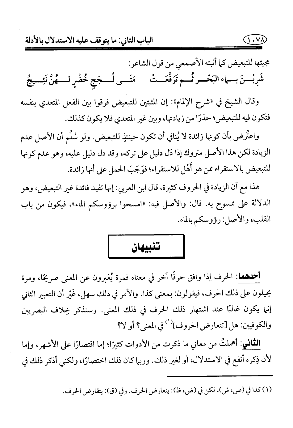 وقال الشيخ في "شرح الإلمام": إن المثبتين للتبعيض فرقوا بين الفعل المتعدي بنفسه فتكون فيه للتبعيض؛ حذرًا من زيادتها، وبين غير المتعدي فلا يكون كذلك.