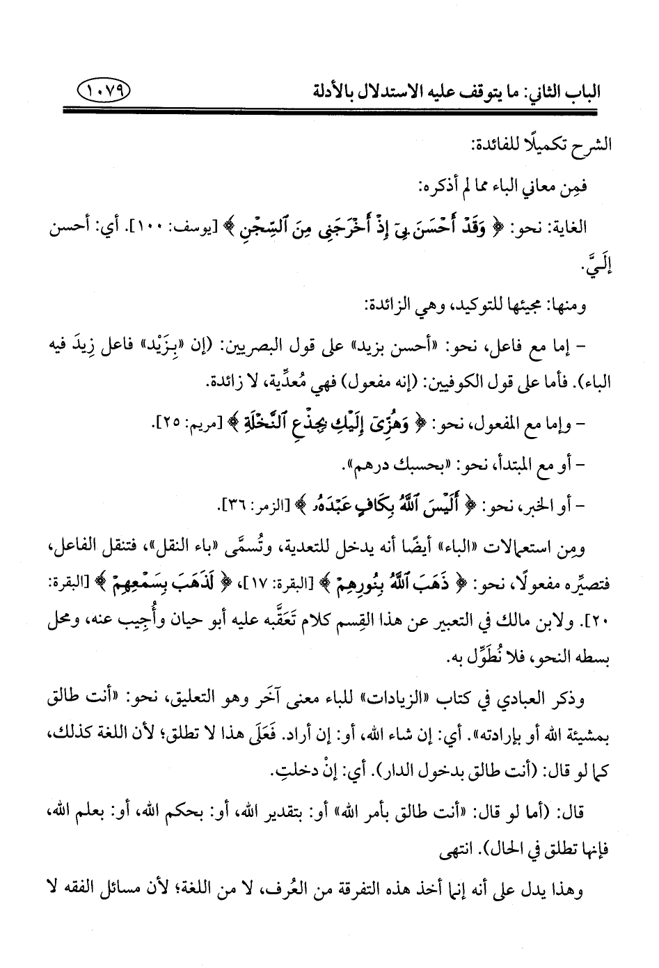 ومن استعمالات "الباء" أيضًا أنه يدخل للتعدية، وتُسمَّى "باء النقل"، فتنقل الفاعل، فتصيِّره مفعولًا، نحو: {ذَهَبَ اللَّهُ بِنُورِهِمْ} [البقرة: ١٧]، {لَذَهَبَ بِسَمْعِهِمْ} [البقرة: ٢٠]. ولابن مالك في التعبير عن هذا القِسم كلام تَعَقَّبه عليه أبو حيان وأُجِيب عنه، ومحل بسطه النحو، فلا نُطَوِّل به.