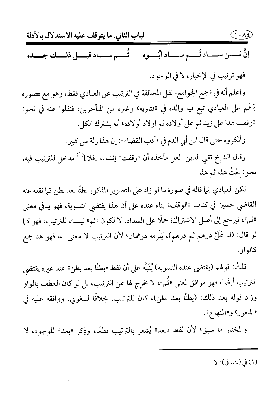 واعلم أنه في "جمع الجوامع" نقل المخالفة في الترتيب عن العبادي فقط، وهو مع قصوره وَهْم على العبادي تبع فيه والده في "فتاويه" وغيره من المتأخرين، فنقلوا عنه في نحو: "وقفت هذا على زيد ثم على أولاده ثم أولاد أولاده" أنه يشترك الكل.