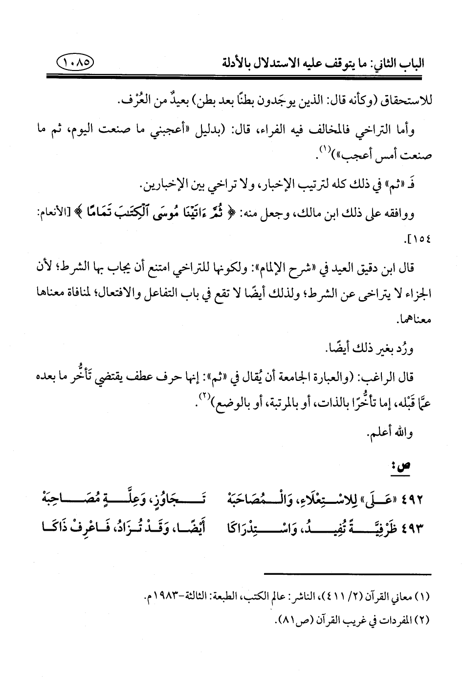 قال الراغب: (والعبارة الجامعة أن يُقال في "ثم": إنها حرف عطف يقتضي تَأخُّر ما بعده عمَّا قَبْله، إما تأخُّرًا بالذات، أو بالمرتبة، أو بالوضع) (¬٢).