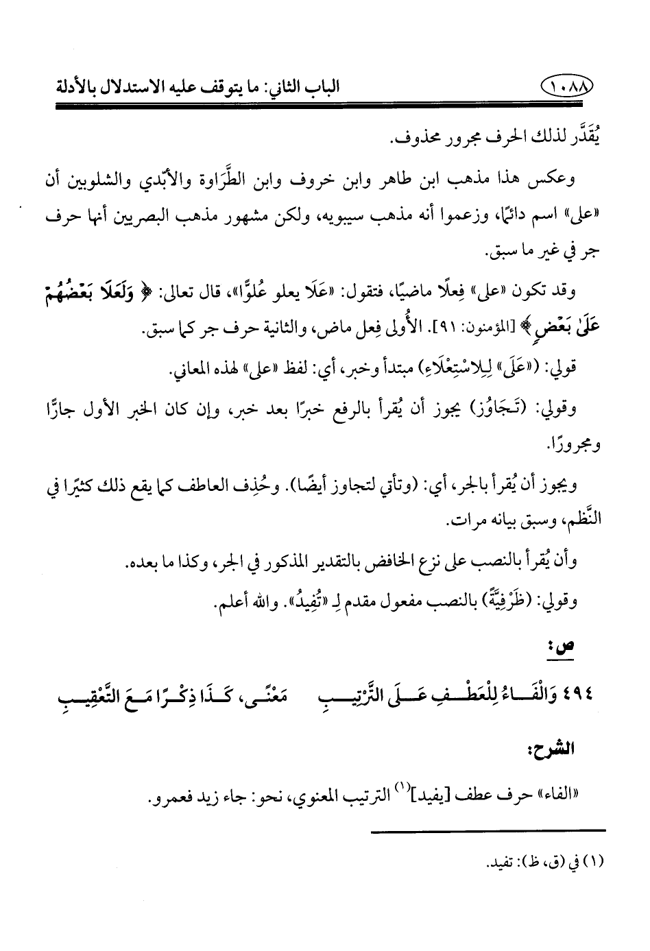 ٤٩٤ - وَالْفَاءُ لِلْعَطْفِ عَلَى التَّرتيبِ ... مَعْنًى، كَذَا ذِكْرًا مَعَ التَّعْقِيبِ