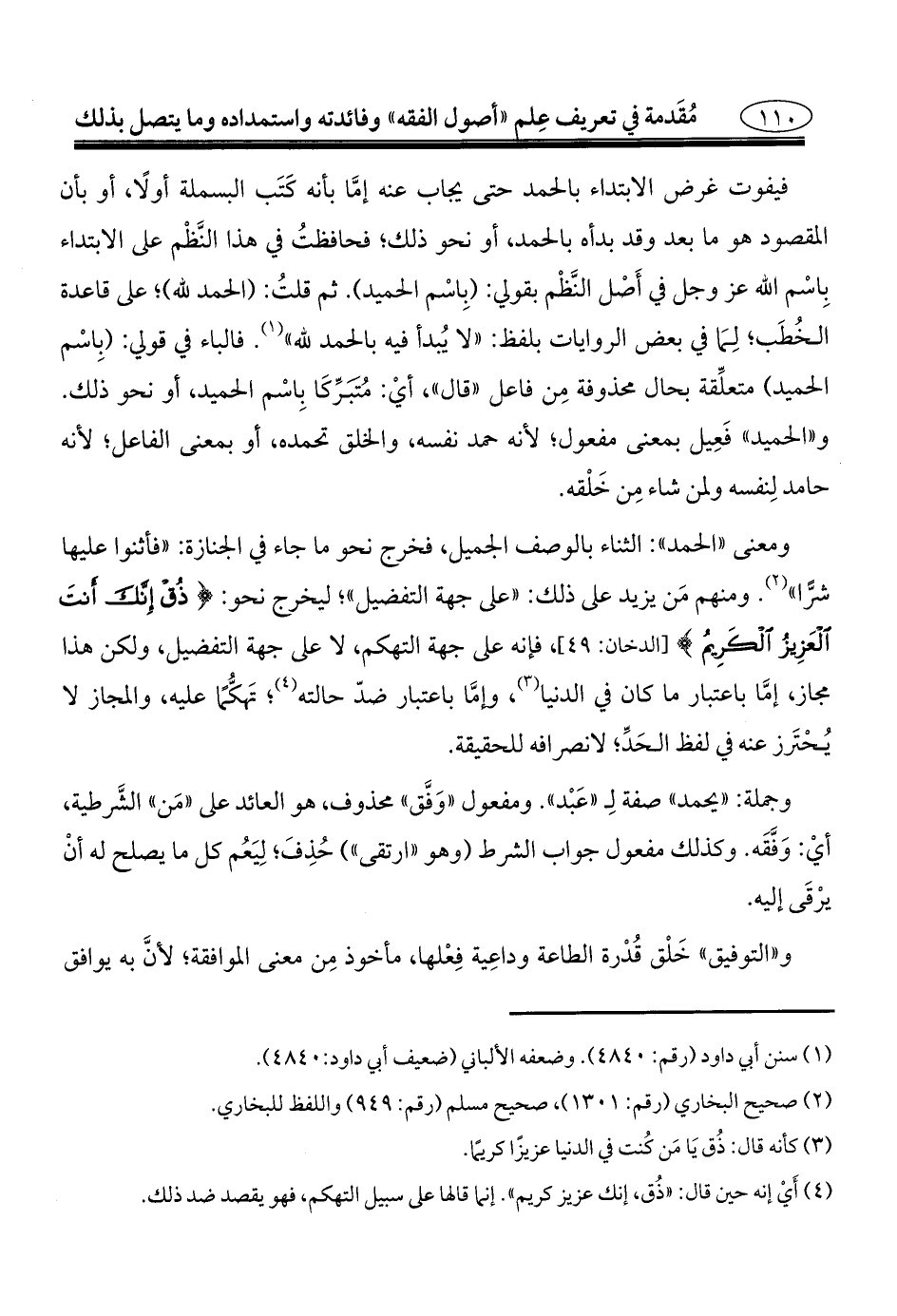 فيفوت غرض الابتداء بالحمد حتى يجاب عنه إمَّا بأنه كَتَب البسملة أولًا، أو بأن المقصود هو ما بعد وقد بدأه بالحمد، أو نحو ذلك؛ فحافظتُ في هذا النَّظْم على الابتداء بِاسْم الله عز وجل في أَصْل النَّظْم بقولي: (بِاسْم الحميد). ثم قلتُ: (الحمد لله)؛ على قاعدة الخُطَب؛ لِمَا في بعض الروايات بلفظ: "لا يُبدأ فيه بالحمد لله" (¬١). فالباء في قولي: (بِاسْم الحميد) متعلِّقة بحال محذوفة مِن فاعل "قال"، أيْ: مُتبَرِّكَا بِاسْم الحميد، أو نحو ذلك. و"الحميد" فَعِيل بمعنى مفعول؛ لأنه حمد نفسه، والخلق تحمده، أو بمعنى الفاعل؛ لأنه حامد لِنفسه ولمن شاء مِن خَلْقه.