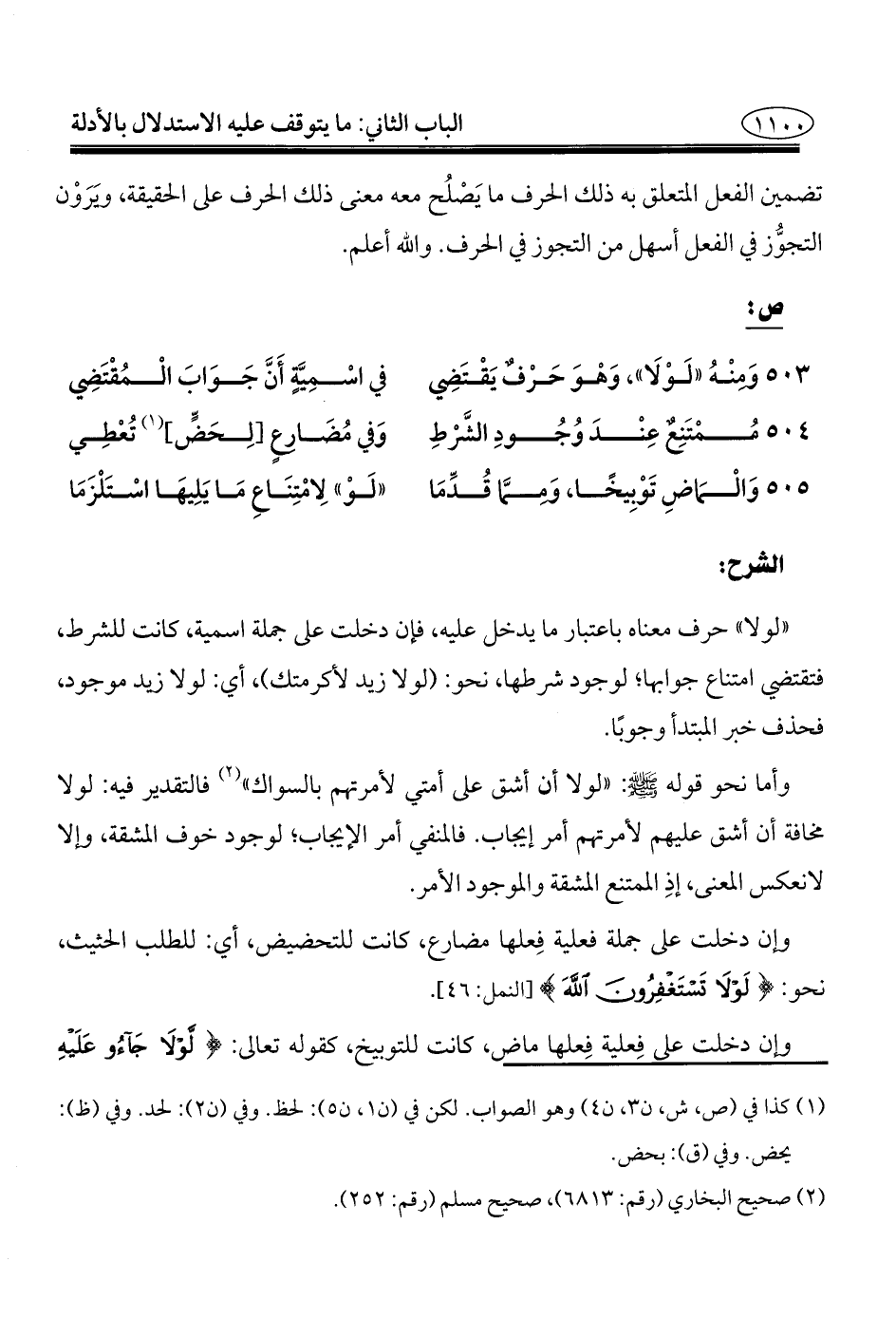 ٥٠٣ - وَمنْهُ "لَوْلَا"، وَهْوَ حَرْفٌ يَقْتَضِي ... في اسْمِيَّةٍ أَنَّ جَوَابَ الْمُقْتَضِي