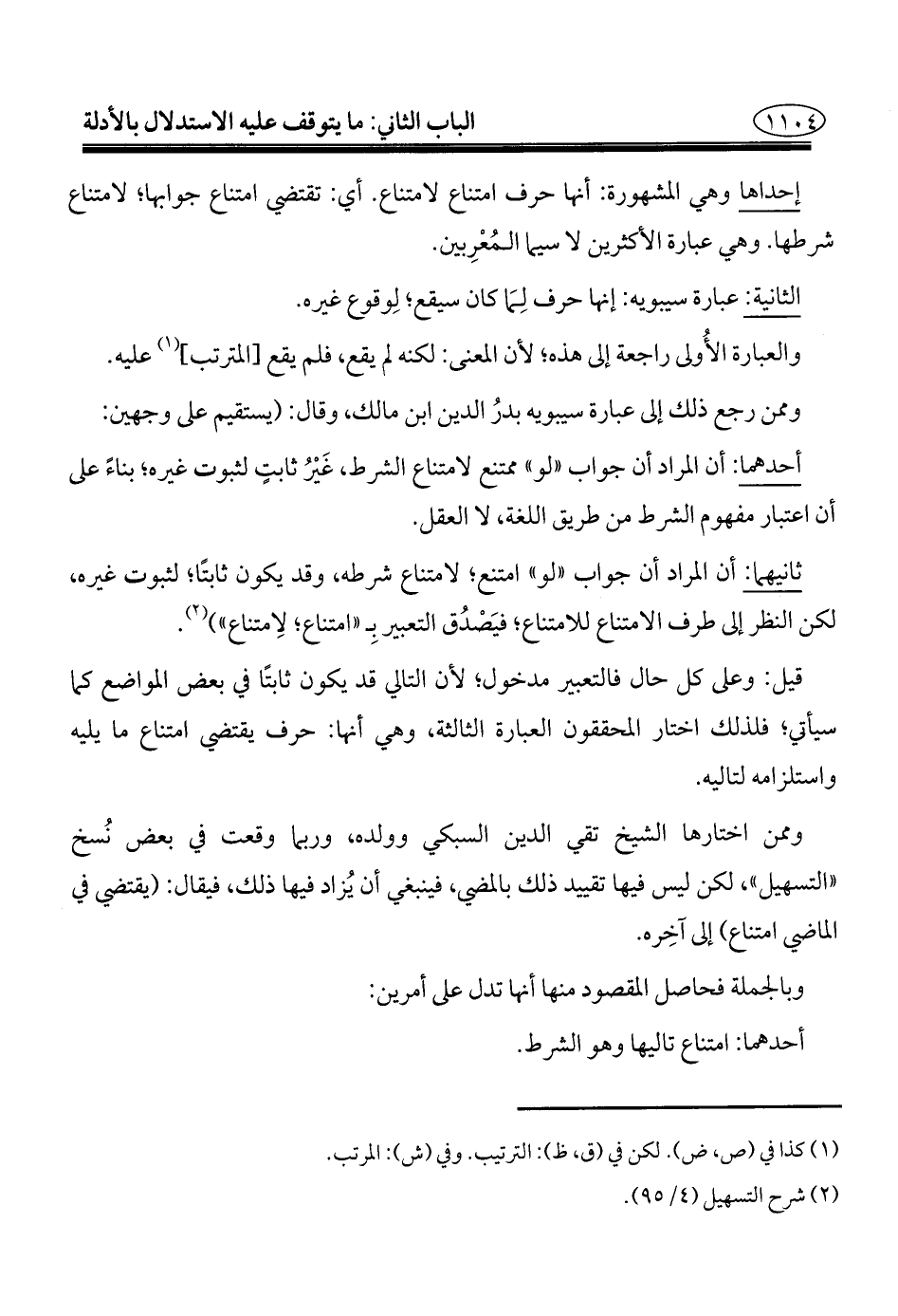 قيل: وعلى كل حال فالتعبير مدخول؛ لأن التالي قد يكون ثابتًا في بعض المواضع كما سيأتي؛ فلذلك اختار المحققون العبارة الثالثة، وهي أنها: حرف يقتضي امتناع ما يليه واستلزامه لتاليه.