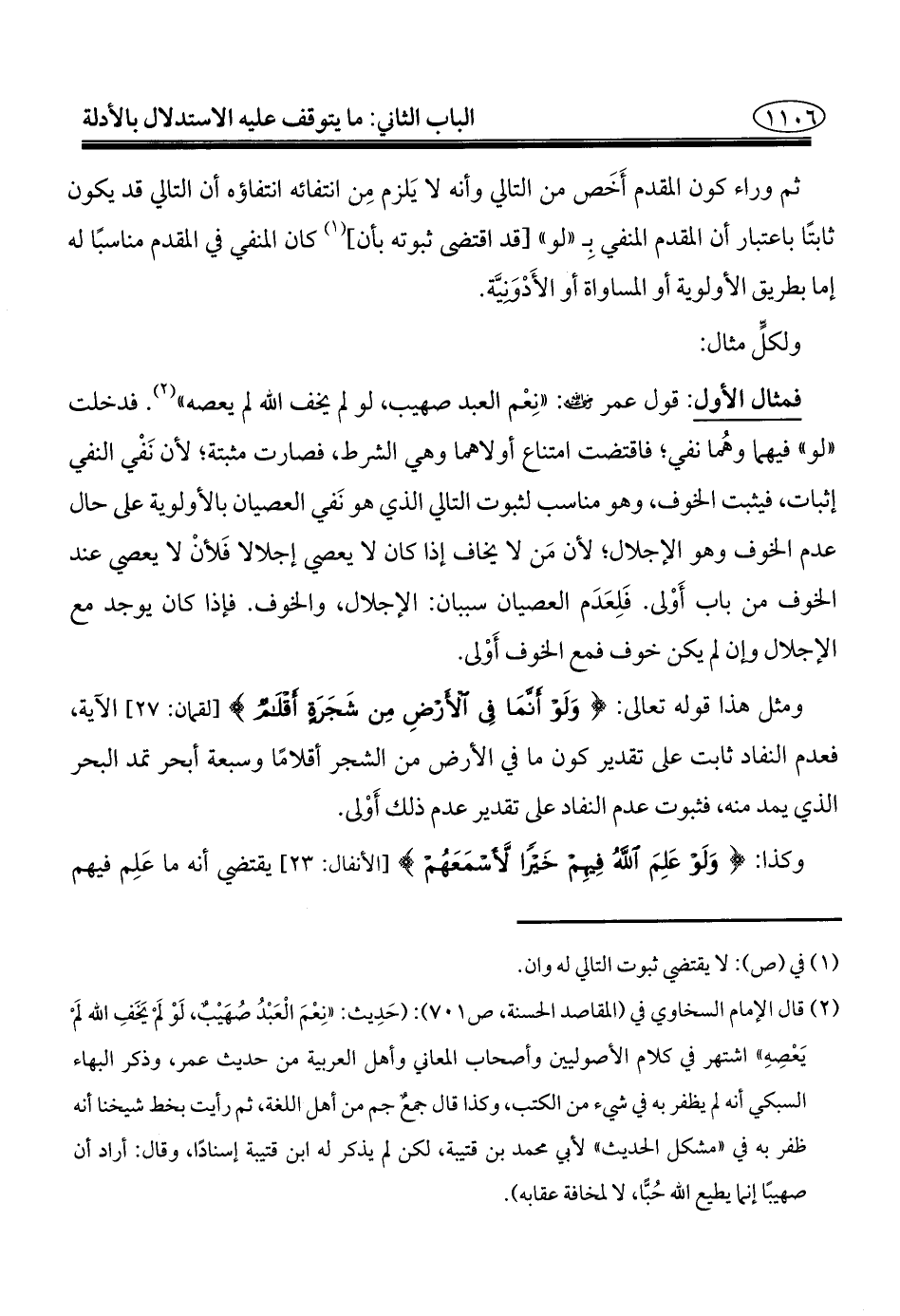 فمثال الأول: قول عمر - رضي الله عنه -: "نِعْم العبد صهيب، لو لم يخف الله لم يعصه" (¬٢). فدخلت "لو" فيهما وهُما نفي؛ فاقتضت امتناع أولاهما وهي الشرط، فصارت مثبتة؛ لأن نَفْي النفي إثبات، فيثبت الخوف، وهو مناسب لثبوت التالي الذي هو نَفي العصيان بالأولوية على حال عدم الخوف وهو الإجلال؛ لأن مَن لا يخاف إذا كان لا يعصي إجلالا فَلأنْ لا يعصي عند الخوف من باب أَوْلى. فَلِعَدَم العصيان سببان: الإجلال، والخوف. فإذا كان يوجد مع الإجلال وإن لم يكن خوف فمع الخوف أَوْلى.