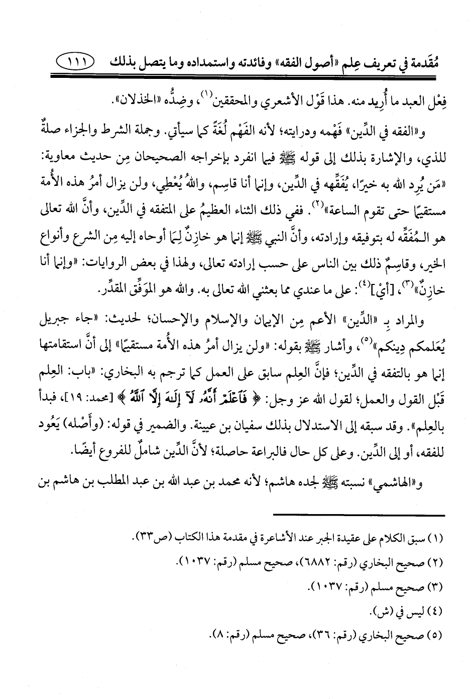 والمراد بِـ "الدِّين" الأعم مِن الإيمان والإسلام والإحسان؛ لحديث: "جاء جبريل يُعَلمكم دِينكم" (¬٥)، وأشار - صلى الله عليه وسلم - بقوله: "ولن يزال أمرُ هذه الأُمة مستقيمًا" إلى أنَّ استقامتها إنما هو بالتفقه في الدِّين؛ فإنَّ العِلم سابق على العمل كما ترجم به البخاري: "باب: العِلم قَبْل القول والعمل؛ لقول الله عز وجل: {فَاعْلَمْ أَنَّهُ لَا إِلَهَ إِلَّا اللَّهُ} [محمد: ١٩]، فبدأ بالعِلم". وقد سبقه إلى الاستدلال بذلك سفيان بن عيينة. والضمير في قوله: (وأَصْله) يَعُود للفقه، أو إلى الدِّين. وعلى كل حال فالبراعة حاصلة؛ لأنَّ الدِّين شاملٌ للفروع أيضًا.