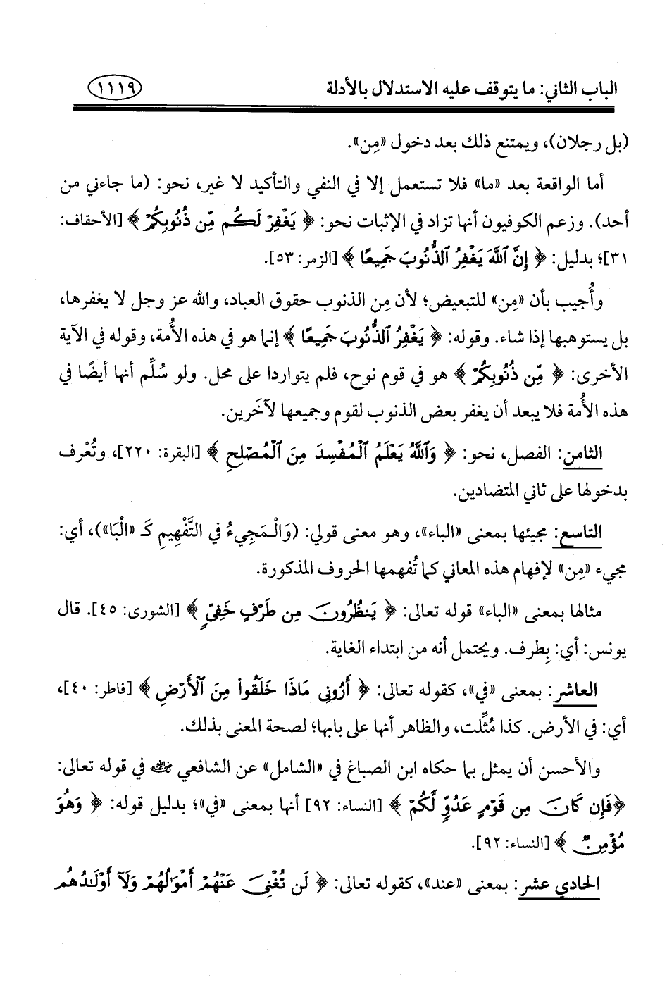 التاسع: مجيئها بمعنى "الباء"، وهو معنى قولي: (وَالْمَجِيءُ في التَّفْهِيمِ كـ "الْبَا")، أي: مجيء "مِن" لإفهام هذه المعاني كما تُفهمها الحروف المذكورة.