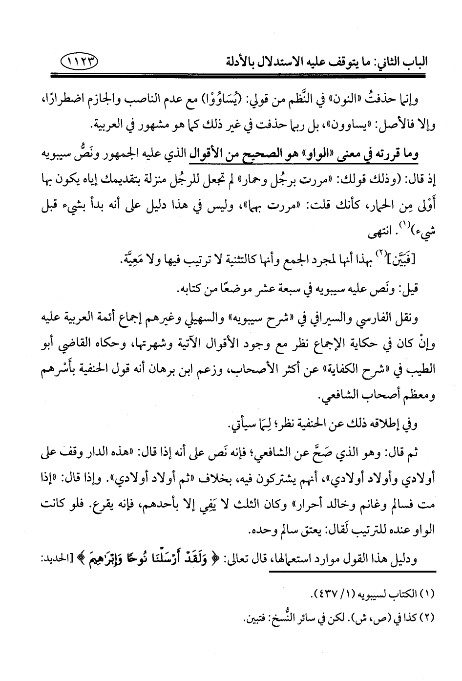 وما قررته في معنى "الواو" هو الصحيح من الأقوال الذي عليه الجمهور ونَصُّ سيبويه إذ قال: (وذلك قولك: "مررت برجُل وحمار" لم تجعل للرجُل منزلة بتقديمك إياه يكون بها أَوْلى مِن الحمار، كأنك قلت: "مررت بهما"، وليس في هذا دليل على أنه بدأ بشيء قبل شيء) (¬١). انتهى