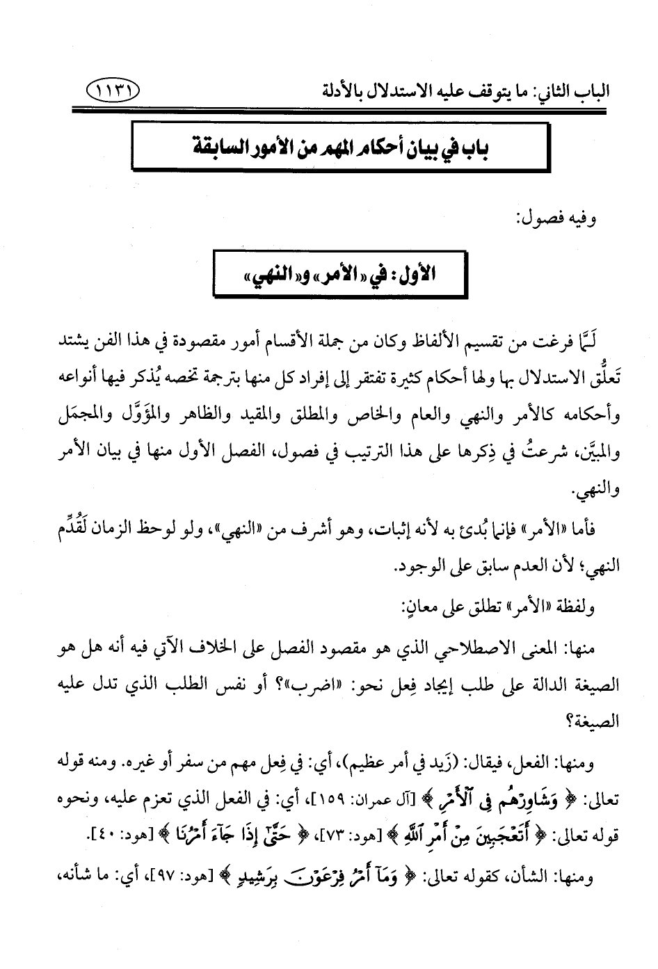 لَمَّا فرغت من تقسيم الألفاظ وكان من جملة الأقسام أمور مقصودة في هذا الفن يشتد تَعلُّق الاستدلال بها ولها أحكام كثيرة تفتقر إلى إفراد كل منها بترجمة تخصه يُذكر فيها أنواعه وأحكامه كالأمر والنهي والعام والخاص والمطلق والمقيد والظاهر والمؤَوَّل والمجمَل والمبيَّن، شرعتُ في ذِكرها على هذا الترتيب في فصول، الفصل الأول منها في بيان الأمر والنهي.