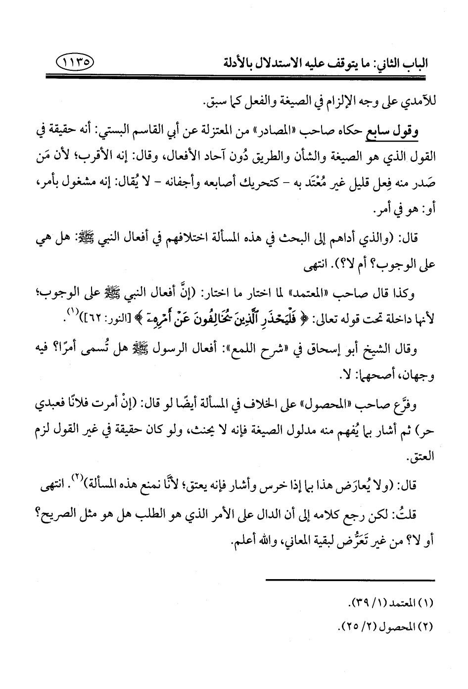 وكذا قال صاحب "المعتمد" لما اختار ما اختار: (إنَّ أفعال النبي - صلى الله عليه وسلم - على الوجوب" لأنها داخلة تحت قوله تعالى: {فَلْيَحْذَرِ الَّذِينَ يُخَالِفُونَ عَنْ أَمْرِهِ} [النور: ٦٢]) (¬١).