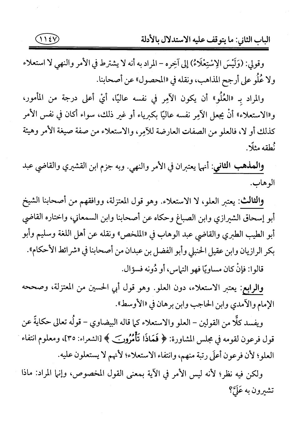 ويفسد كلاًّ من القولين -العلو والاستعلاء كما قاله البيضاوي- قولُه تعالى حكايةً عن قول فرعون لقومه في مجلس المشاورة: {فَمَاذَا تَأْمُرُونَ} [الشعراء: ٣٥]، ومعلوم انتفاء العلو؛ لأن فرعون أعلَى رتبة منهم، وانتفاء الاستعلاء؛ لأنهم لا يستعلون عليه.