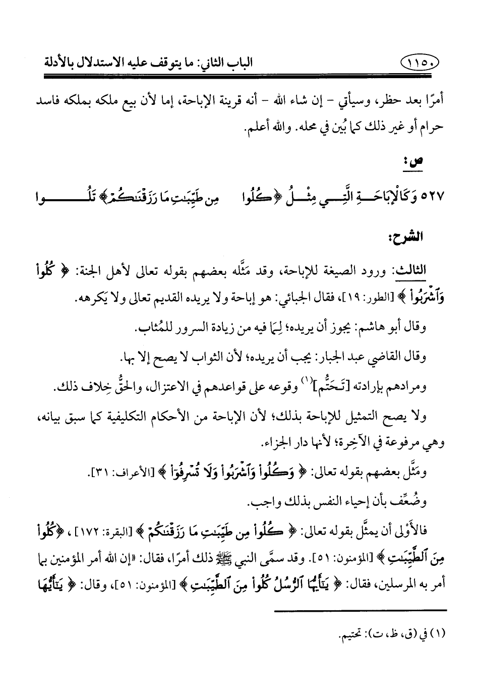 فالأَوْلى أن يمثَّل بقوله تعالى: {كُلُوا مِنْ طَيِّبَاتِ مَا رَزَقْنَاكُمْ} [البقرة: ١٧٢]، {كُلُوا مِنَ الطَّيِّبَاتِ} [المؤمنون: ٥١].
