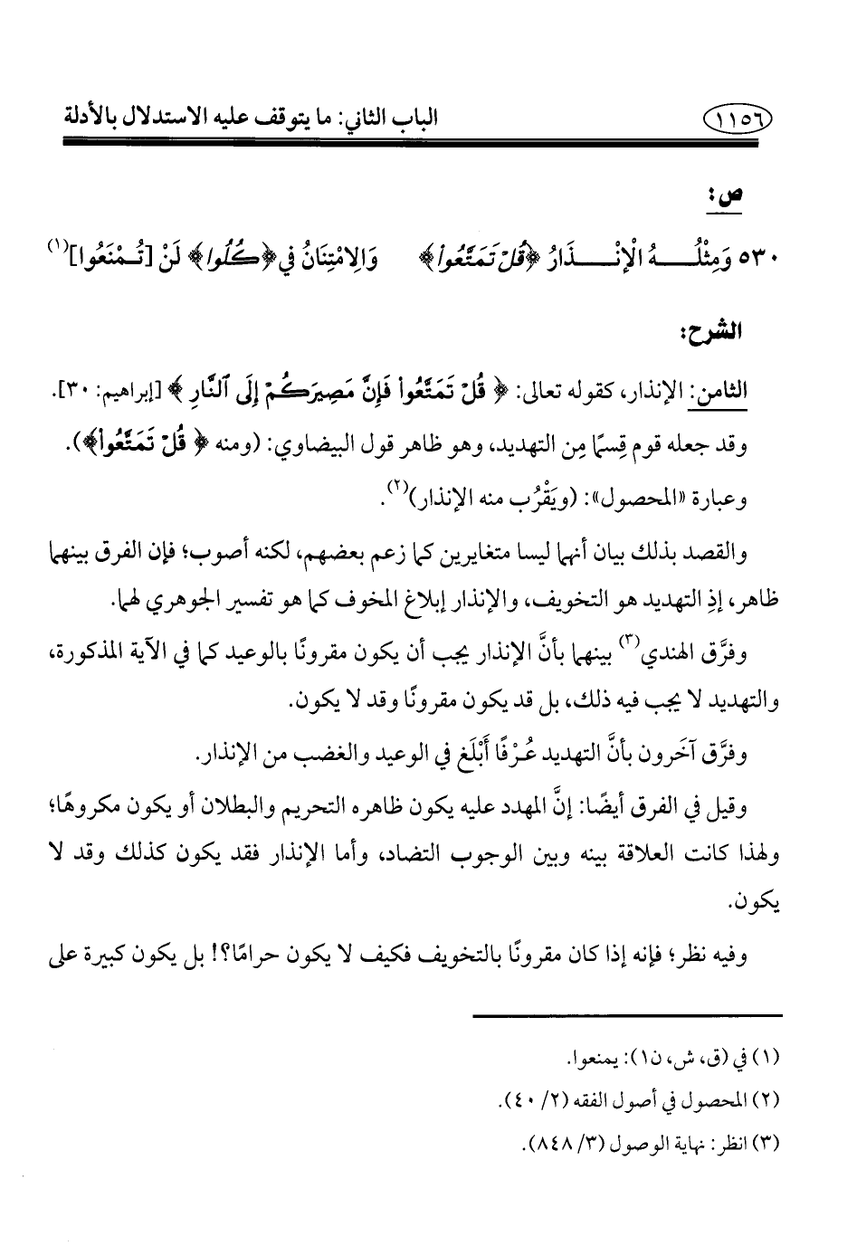 ٥٣٠ - وَمِثْلُهُ الْإنْذَارُ {قُلْ تَمَتَّعُوا} ... وَالِامْتِنَانُ في {كُلُوا} لَنْ [تُمْنَعُوا] (¬١)