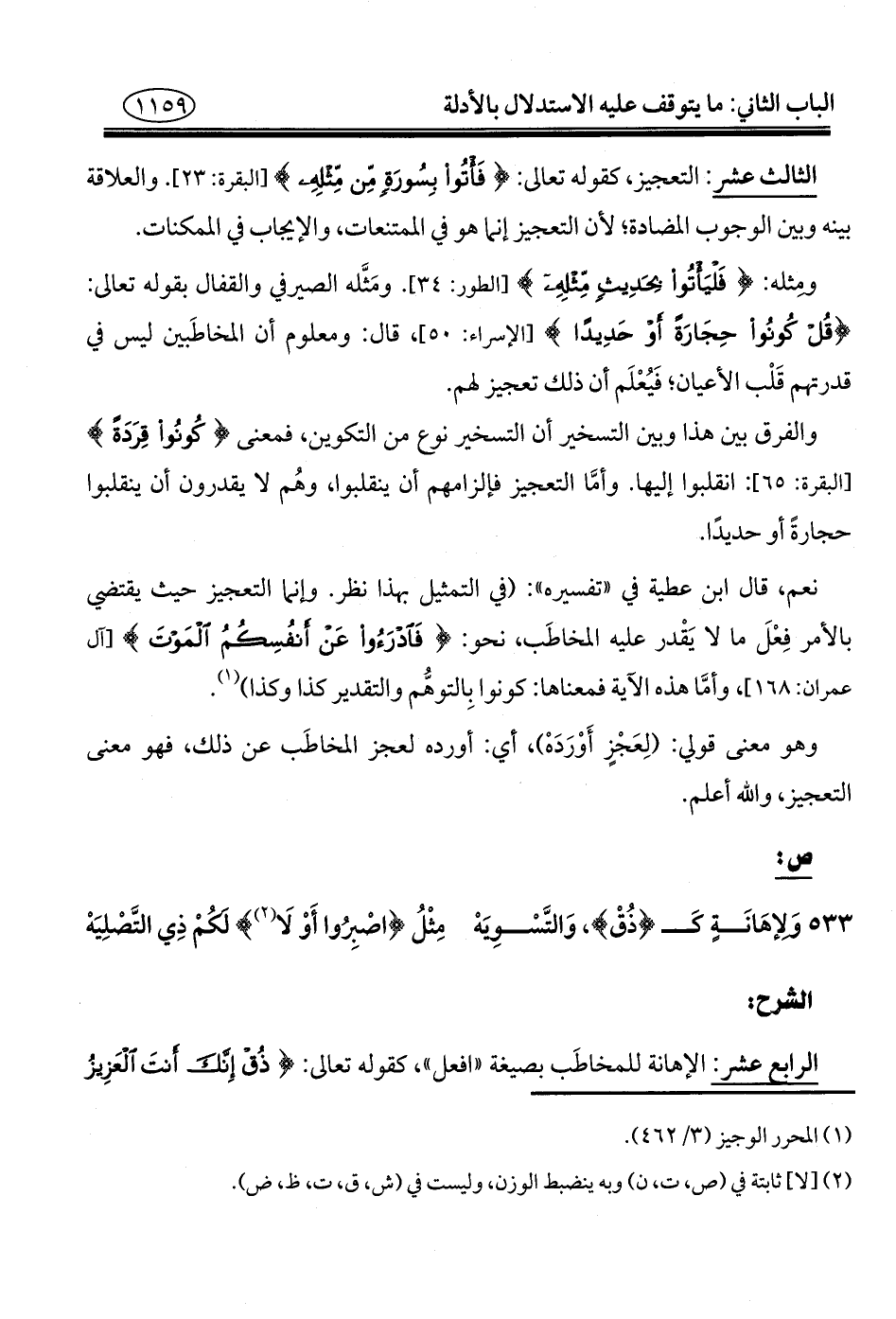 ومثله: {فَلْيَأْتُوا بِحَدِيثٍ مِثْلِهِ} [الطور: ٣٤]. ومَثَّله الصيرفي والقفال بقوله تعالى: {قُلْ كُونُوا حِجَارَةً أَوْ حَدِيدًا (٥٠)} [الإسراء: ٥٠]، قال: ومعلوم أن المخاطَبين ليس في قدرتهم قَلْب الأعيان؛ فَيُعْلَم أن ذلك تعجيز لهم.