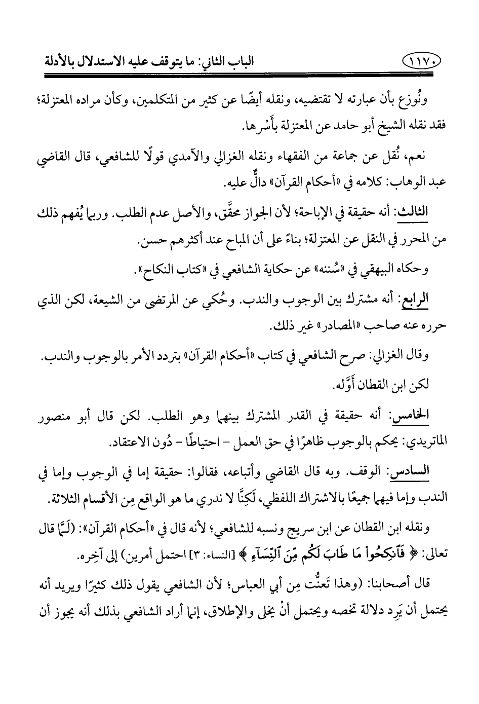 الخامس: أنه حقيقة في القدر المشترك بينهما وهو الطلب. لكن قال أبو منصور الماتريدي: يحكم بالوجوب ظاهرًا في حق العمل -احتياطًا- دُون الاعتقاد.