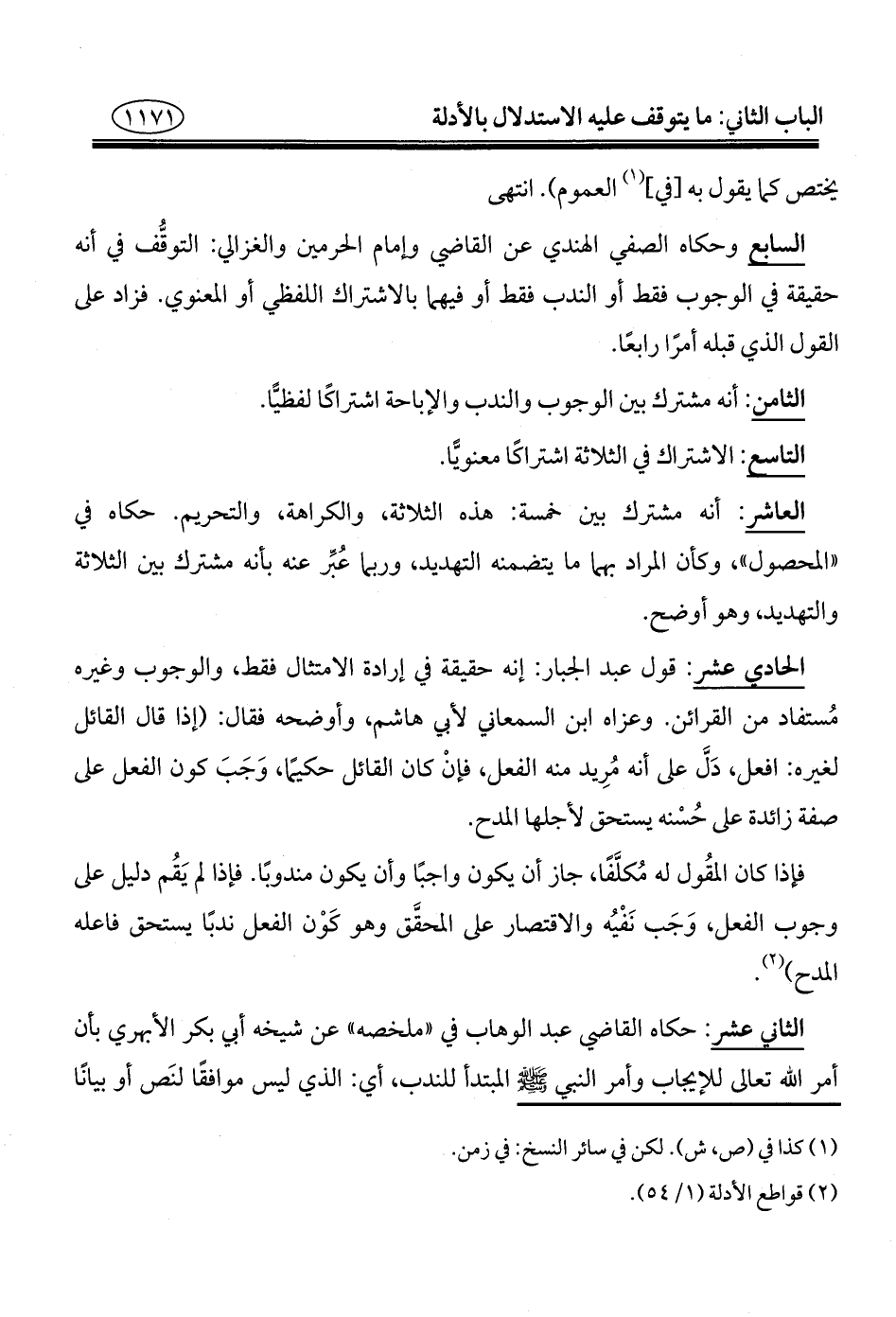 السابع: وحكاه الصفي الهندي عن القاضي وإمام الحرمين والغزالي: التوقُّف في أنه حقيقة في الوجوب فقط أو الندب فقط أو فيهما بالاشتراك اللفظي أو المعنوي. فزاد على القول الذي قبله أمرًا رابعًا.