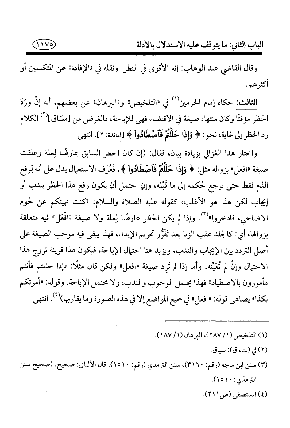 واختار هذا الغزالي بزيادة بيان، فقال: (إن كان الحظر السابق عارضا لِعلة وعلقت صيغة "افعل" بزواله مثل: {وَإِذَا حَلَلْتُمْ فَاصْطَادُوا} [المائدة: ٢]، فَعُرْف الاستعمال يدل على أنه لِرفع الذم فقط حتى يرجع حُكمه إلى ما قَبْله، وإنِ احتمل أن يكون رفع هذا الحظر بندب أو إيجاب لكن هذا هو الأغلب، كقوله عليه الصلاة والسلام: "كنت نهيتكم عن لحوم الأضاحي، فادخروا" (¬٣). وإذا لم يكن الحظر عارضًا لِعلة ولا صيغة "افْعَل" فيه متعلقة بزوالها، أي: كالجلد عقب الزنا بعد تَقَرُّر تحريم الإيذاء، فهذا يبقى فيه موجب الصيغة على أصل التردد بين الإيجاب والندب، ويزيد هنا احتمال الإباحة، فيكون هذا قرينة تروج هذا الاحتمال وإنْ لم تُعَيِّنه. وأما إذا لم تَرِد صيغة "افعل" ولكن قال مثلًا: "إذا حللتم فأنتم مأمورون بالاصطياد" فهذا يحتمل الوجوب والندب، ولا يحتمل الإباحة. وقوله: "أمرتكم بكذا" يضاهي قوله: "افعل" في جميع المواضع إلا في هذه الصورة وما يقاربها) (¬٤). انتهى