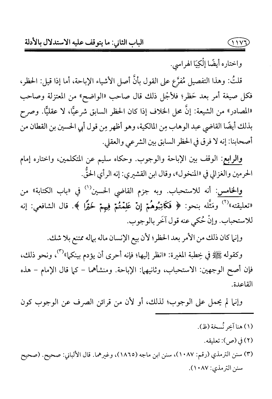 الرابع: الوقف بين الإباحة والوجوب. وحكاه سليم عن المتكلمين، واختاره إمام الحرمين والغزالي في "المنخول"، وقال ابن القشيري: إنه الرأي الحقُّ.