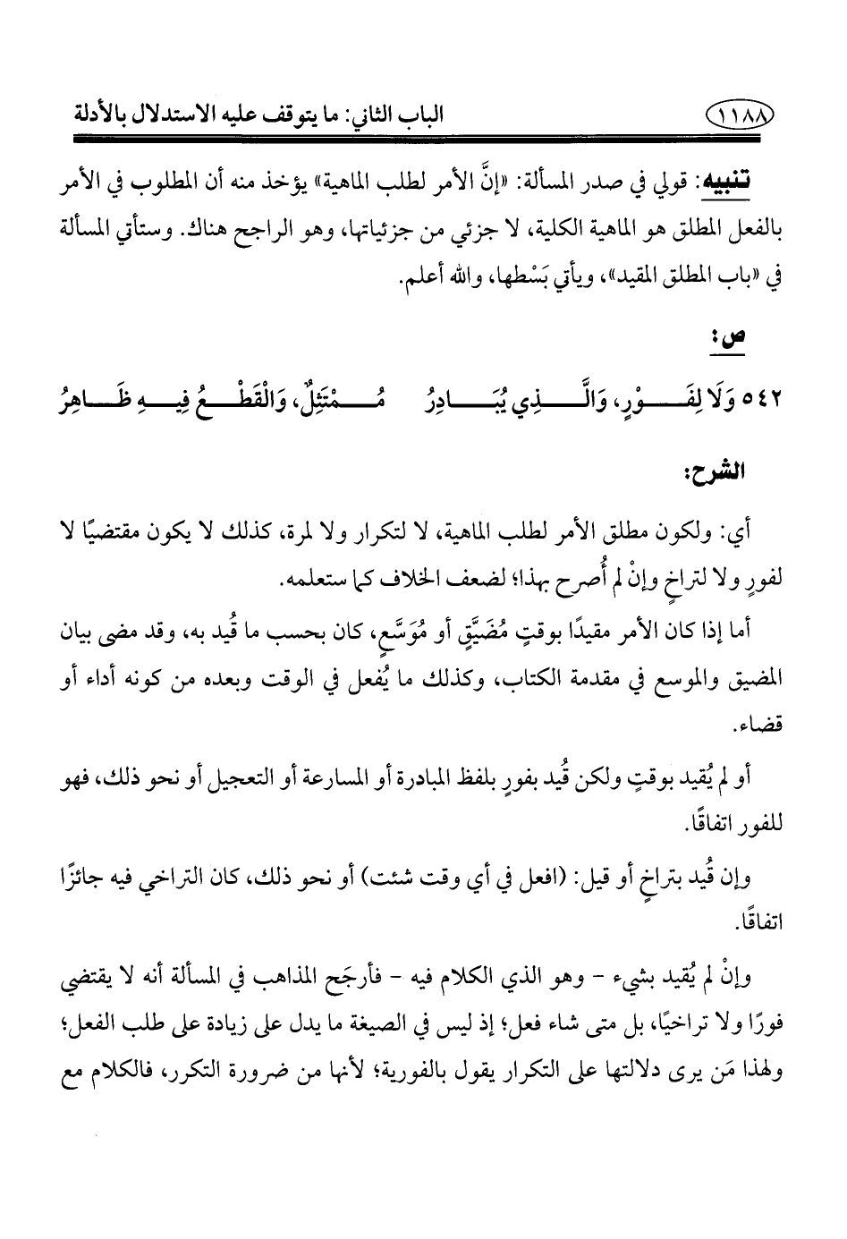 وإنْ لم يُقيد بشيء -وهو الذي الكلام فيه- فأرجَح المذاهب في المسألة أنه لا يقتضي فورًا ولا تراخيًا، بل متى شاء فعل؛ إذ ليس في الصيغة ما يدل على زيادة على طلب الفعل؛ ولهذا مَن يرى دلالتها على التكرار يقول بالفورية؛ لأنها من ضرورة التكرر، فالكلام مع