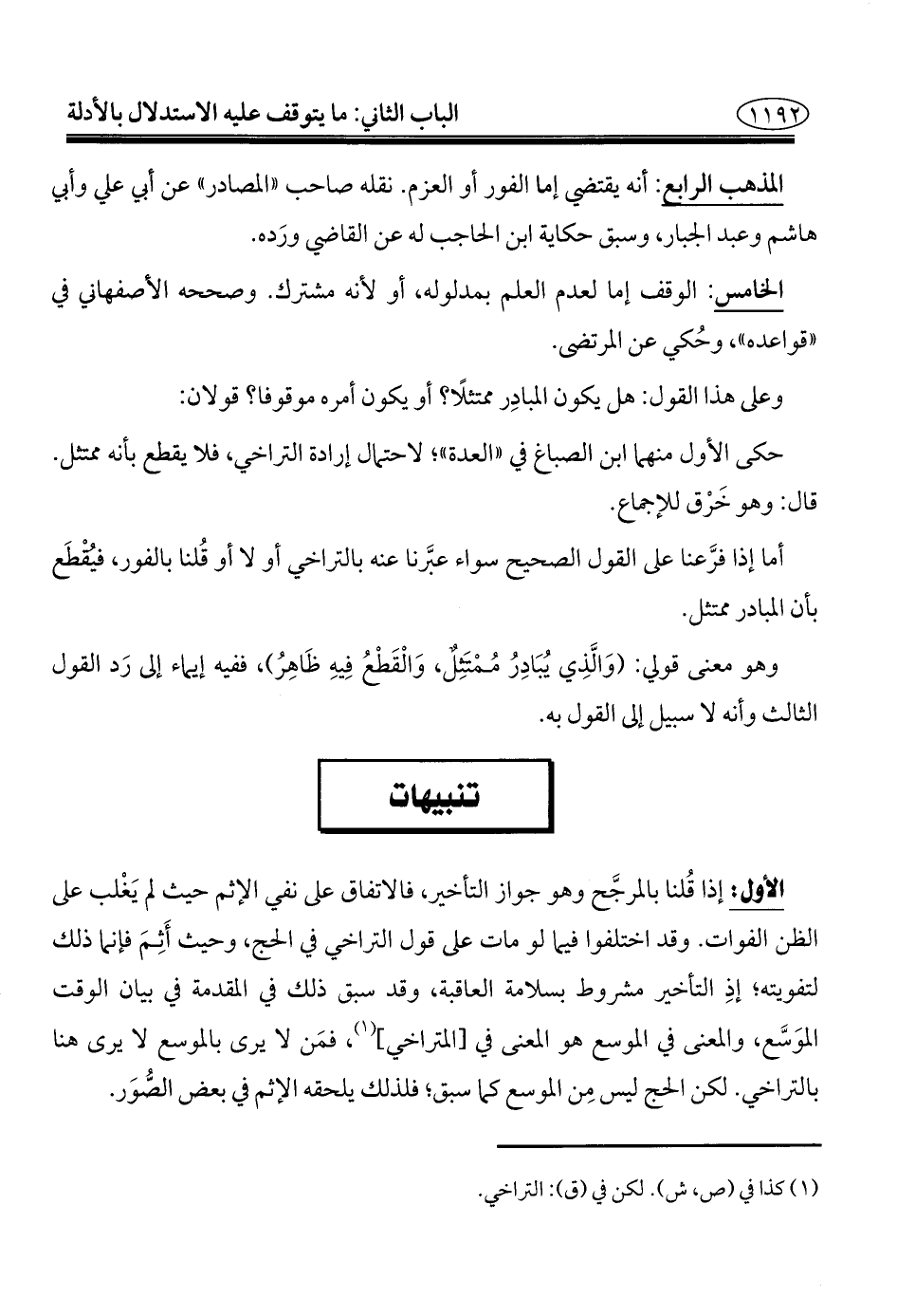 المذهب الرابع: أنه يقتضي إما الفور أو العزم. نقله صاحب "المصادر" عن أبي علي وأبي هاشم وعبد الجبار، وسبق حكاية ابن الحاجب له عن القاضي ورَده.