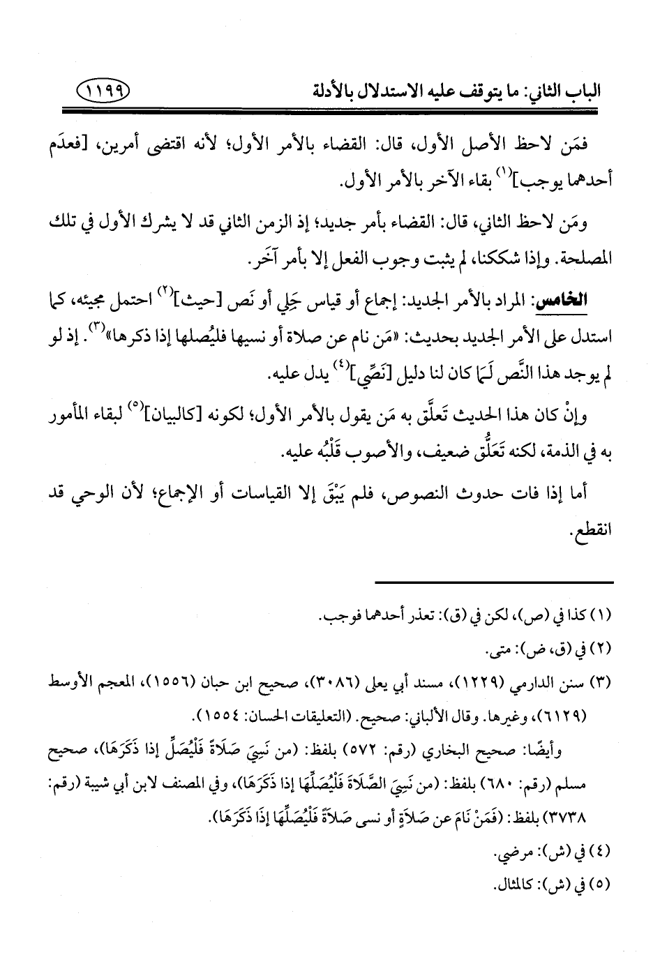 الخامس: المراد بالأمر الجديد: إجماع أو قياس حلي أو نَص [حيث]، (¬٢) احتمل مجيئه، كلما استدل على الأمر الجديد بحديث: "مَن نام عن صلاة أو نسيها فليُصلها إذا ذكرها" (¬٣). إذ لو لم يوجد هذا النَّص لَمَا كان لنا دليل [نَصِّي] (¬٤) يدل عليه.
