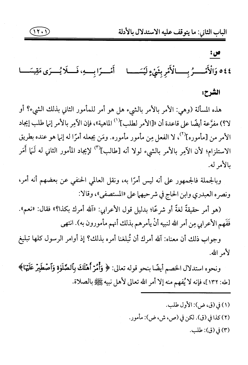 ونحوه استدلال الخصم أيضًا بنحو قوله تعالى: {وَأْمُرْ أَهْلَكَ بِالصَّلَاةِ وَاصْطَبِرْ عَلَيْهَا} [طه: ١٣٢]، فإنه لا يُفهم منه إلا أمر الله تعالى لأهل نبيه - صلى الله عليه وسلم - بالصلاة.