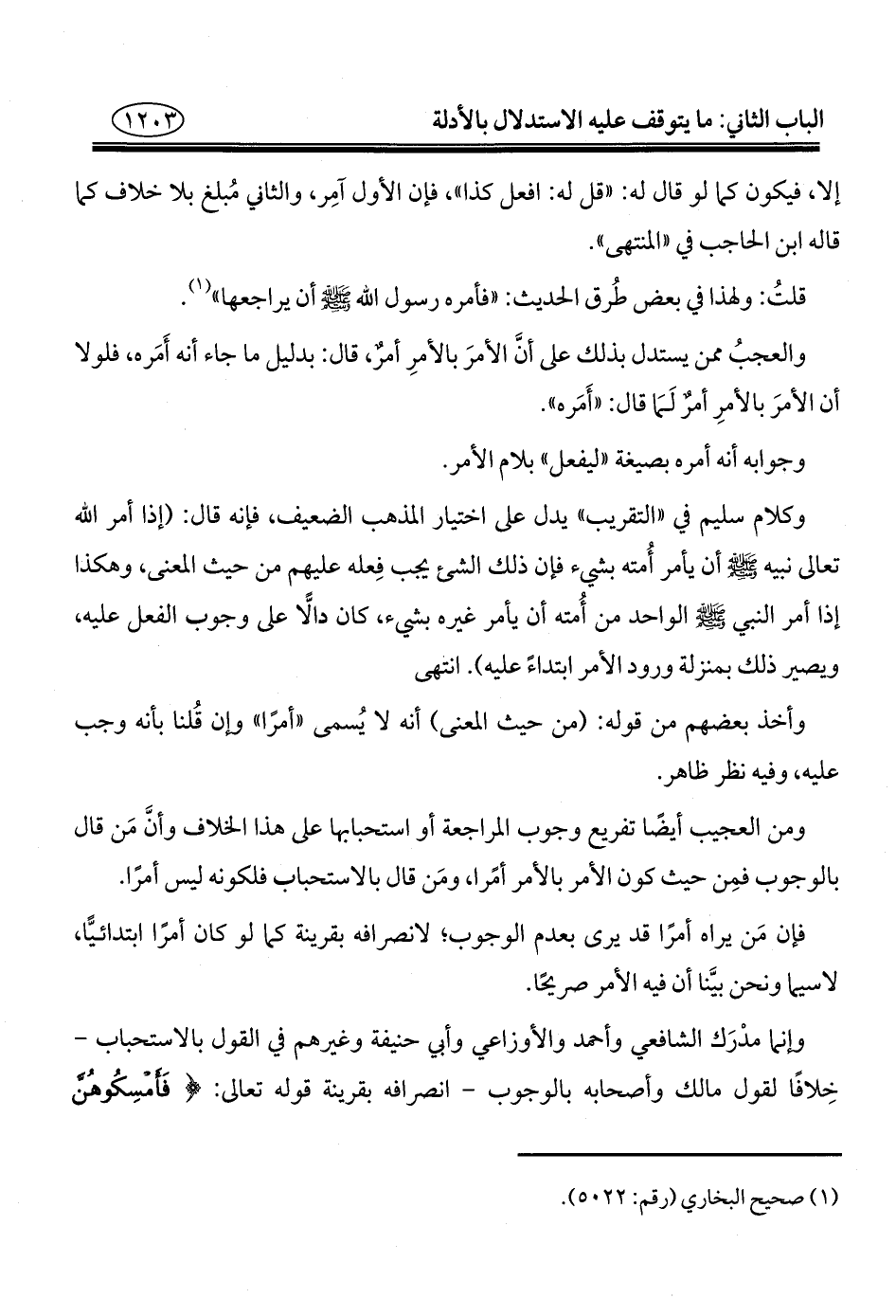 وإنما مدْرَك الشافعي وأحمد والأوزاعي وأبي حنيفة وغيرهم في القول بالاستحباب -خِلافًا لقول مالك وأصحابه بالوجوب- انصرافه بقرينة قوله تعالى: {فَأَمْسِكُوهُنَّ