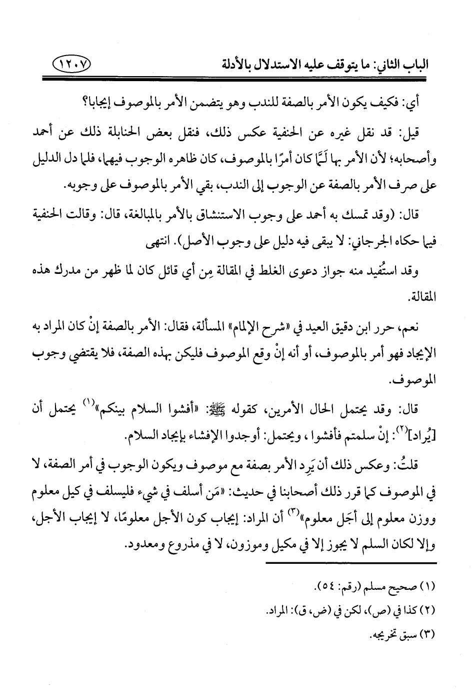 قلتُ: وعكس ذلك أن يَرِد الأمر بصفة مع موصوف ويكون الوجوب في أمر الصفة، لا في الموصوف كما قرر ذلك أصحابنا في حديث: "مَن أسلف في شيء فليسلف في كيل معلوم ووزن معلوم إلى أجَل معلوم" (¬٣) أن المراد: إيجاب كون الأجل معلومًا، لا إيجاب الأجل، وإلا لكان السلم لا يجوز إلا في مكيل وموزون، لا في مذروع ومعدود.