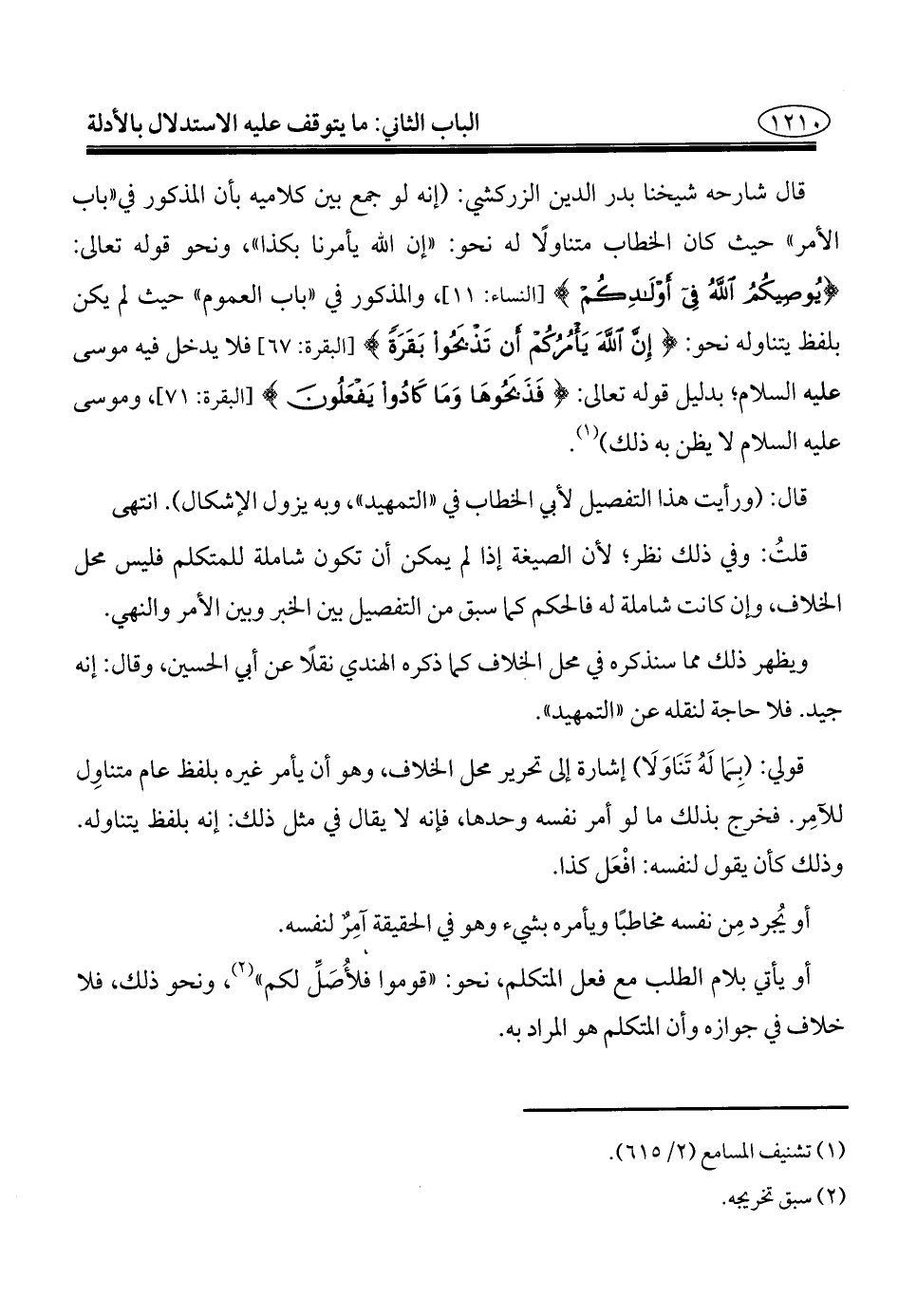 قال شارحه شيخنا بدر الدين الزركشي: (إنه لو جمع بين كلاميه بأن المذكور في "باب الأمر" حيث كان الخطاب متناولًا له نحو: "إن الله يأمرنا بكذا"، ونحو قوله تعالى: {يُوصِيكُمُ اللَّهُ فِي أَوْلَادِكُمْ} [النساء: ١١]، والمذكور في "باب العموم" حيث لم يكن بلفظ يتناوله نحو: {إِنَّ اللَّهَ يَأْمُرُكُمْ أَنْ تَذْبَحُوا بَقَرَةً} [البقرة: ٦٧] فلا يدخل فيه موسى عليه السلام؛ بدليل قوله تعالى: {فَذَبَحُوهَا وَمَا كَادُوا يَفْعَلُونَ} [البقرة: ٧١]، وموسى عليه السلام لا يظن به ذلك) (¬١).