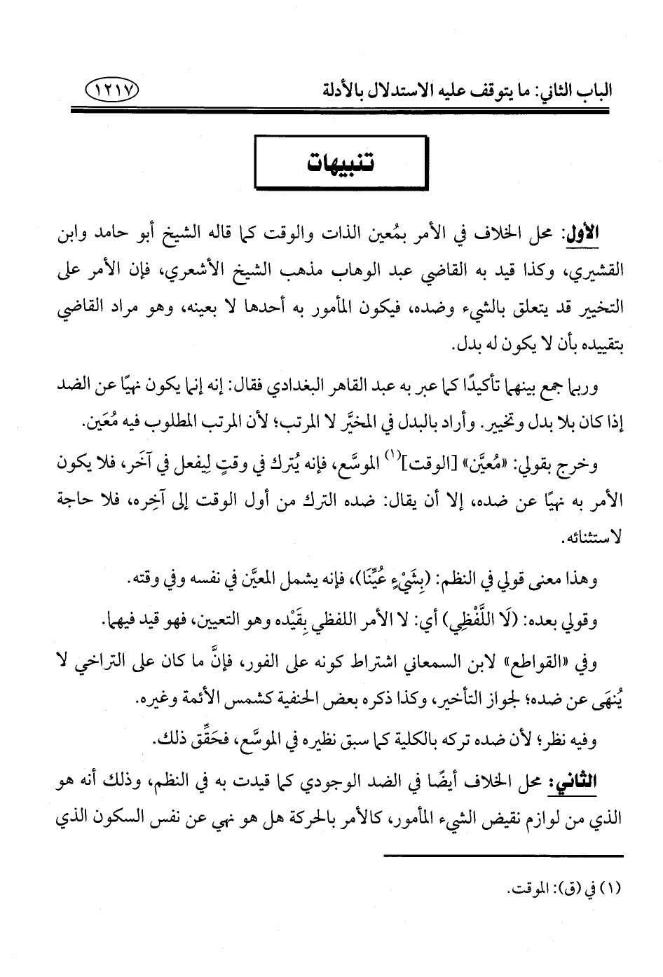 الثاني: محل الخلاف أيضًا في الضد الوجودي كما قيدت به في النظم، وذلك أنه هو الذي من لوازم نقيض الشيء المأمور، كالأمر بالحركة هل هو نهي عن نفس السكون الذي